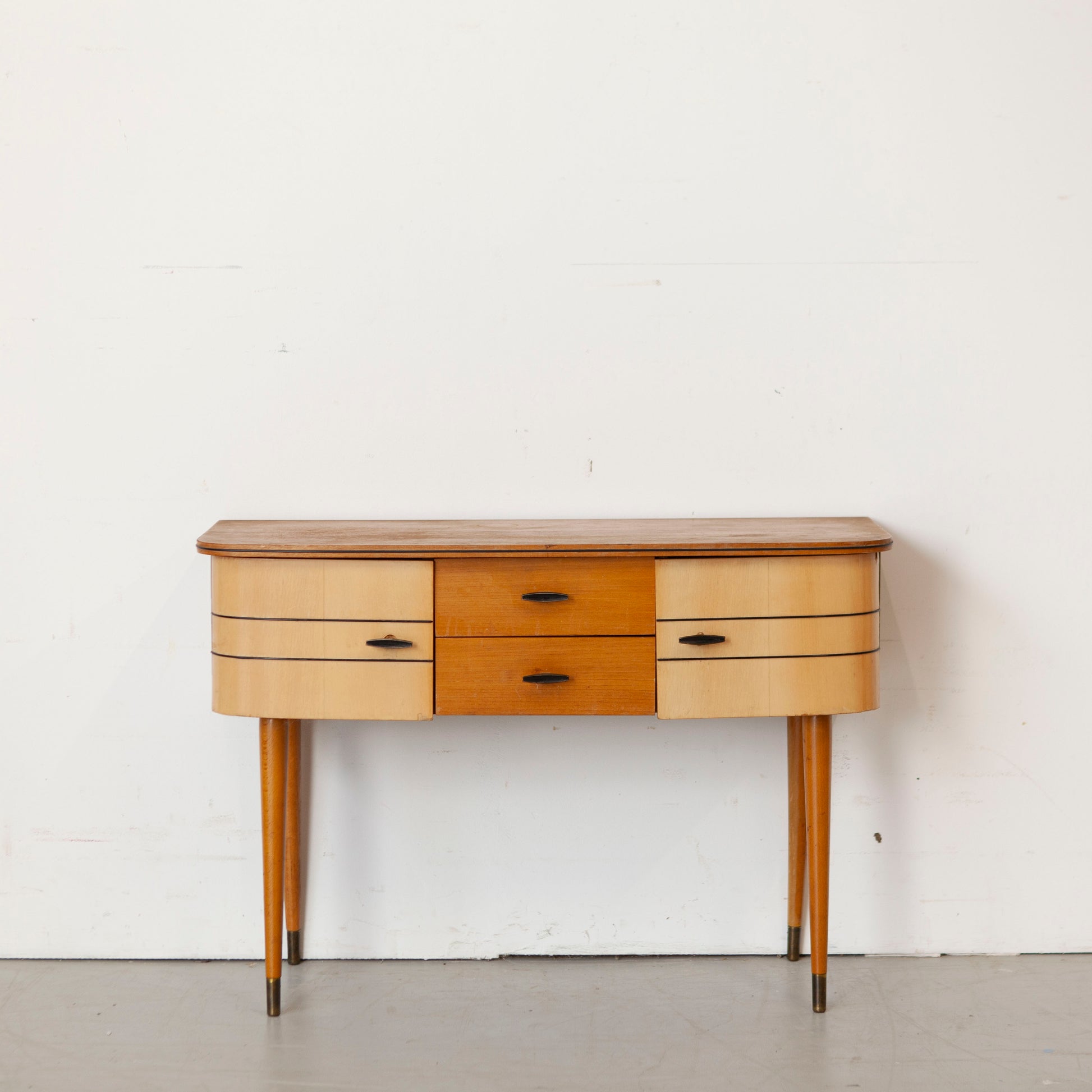 Een charmant klein kastje wat prachtig in huis zal staan! Hij heeft mooie afgeronde deurtjes, originele metalen greepjes en gave pootjes. Bij dit kastje zullen we enkel het bovenblad schilderen, dit kan in een kleur naar keuze. Ook is het mogelijk om het blad niet te schilderen maar naturel te laten, waarbij we het behandelen met een natuurlijke meubelolie.