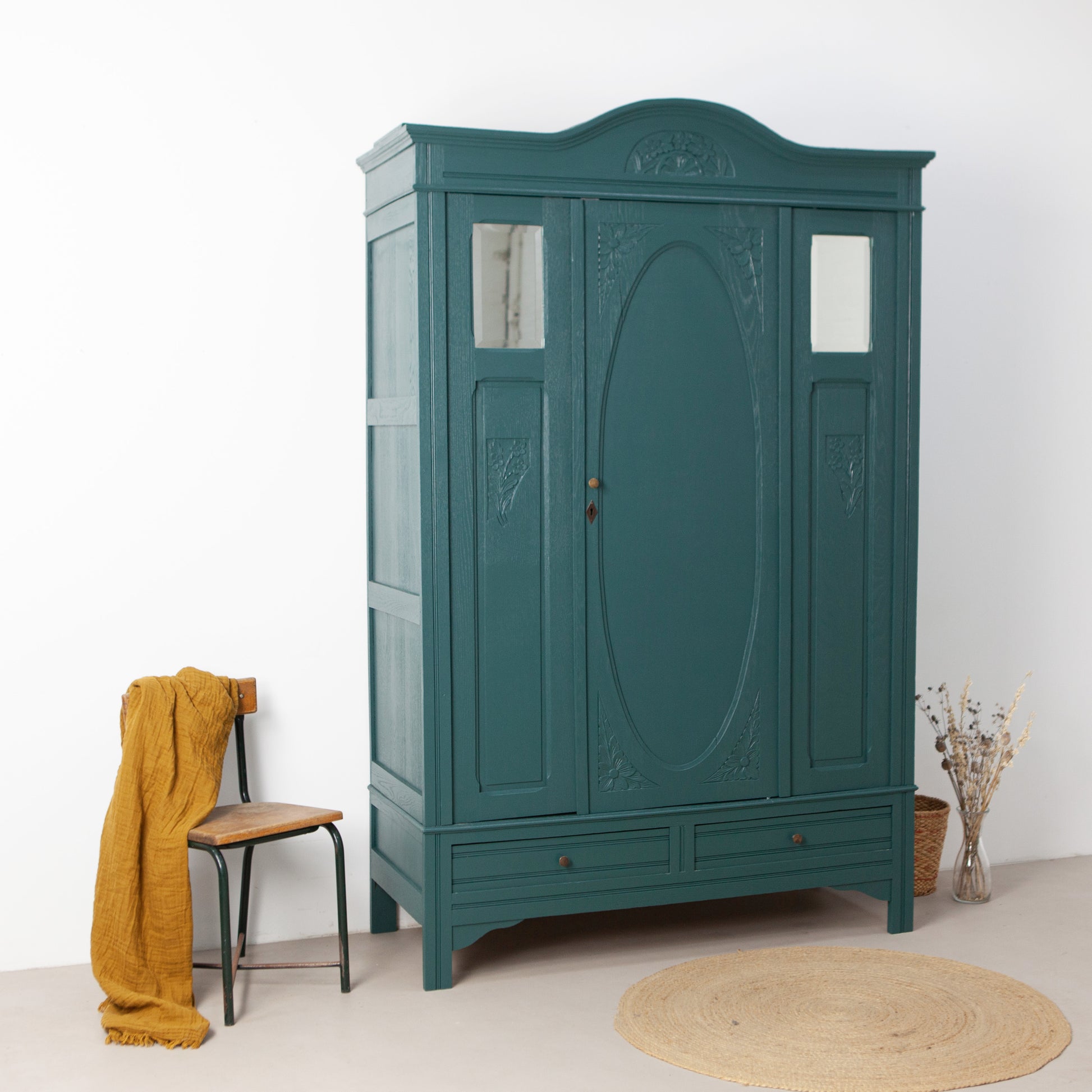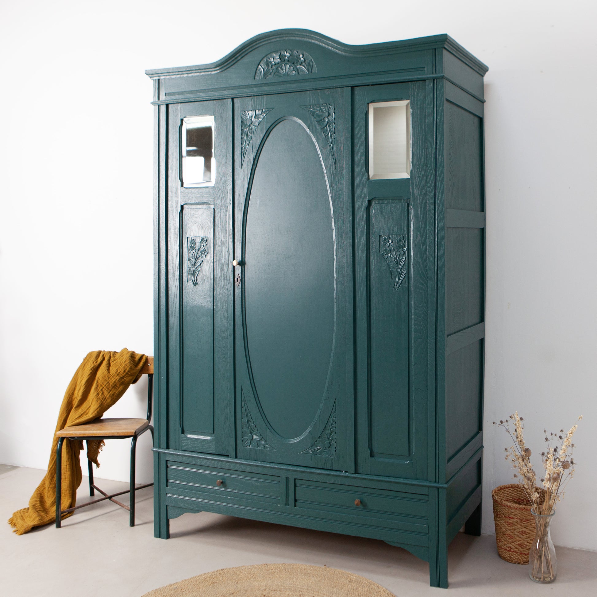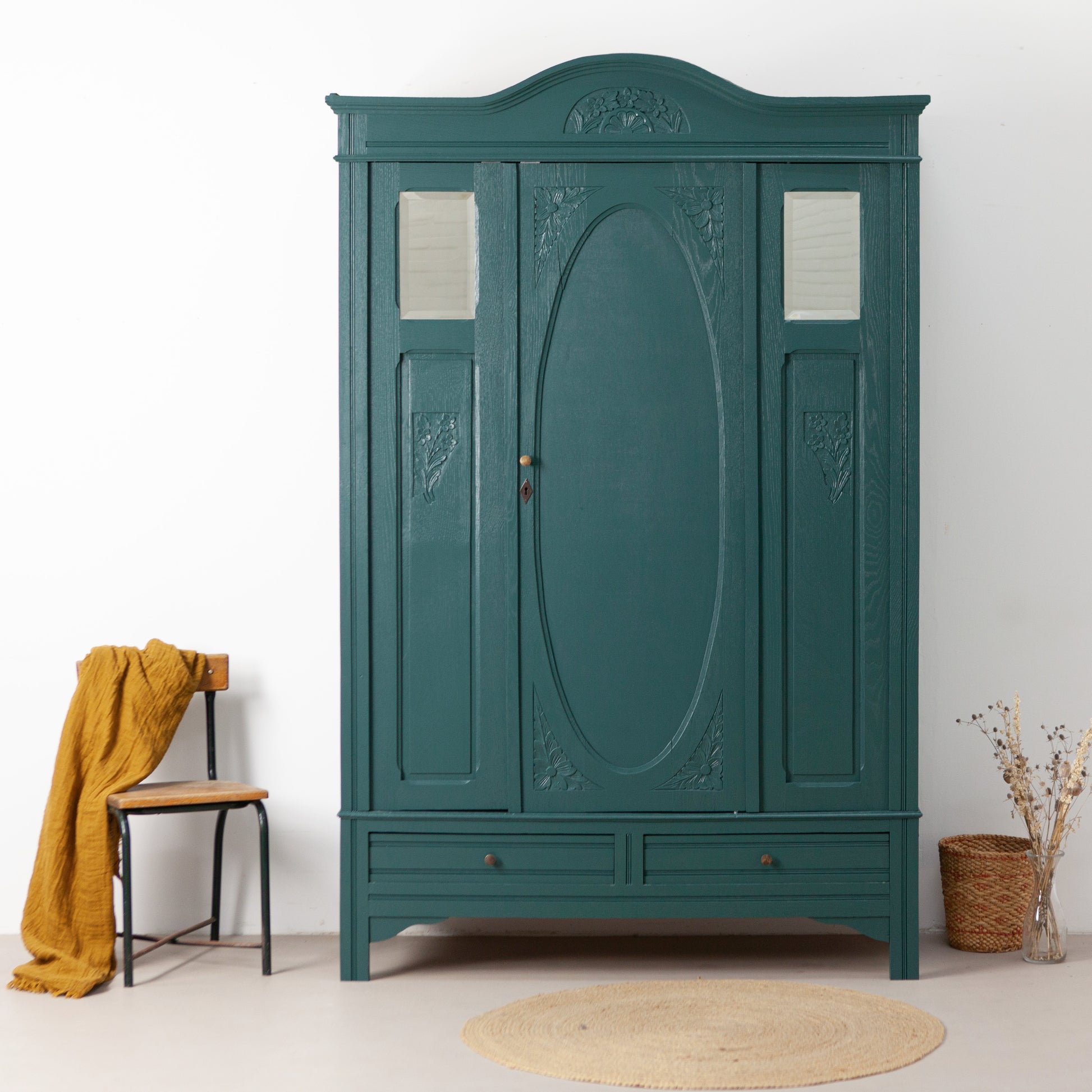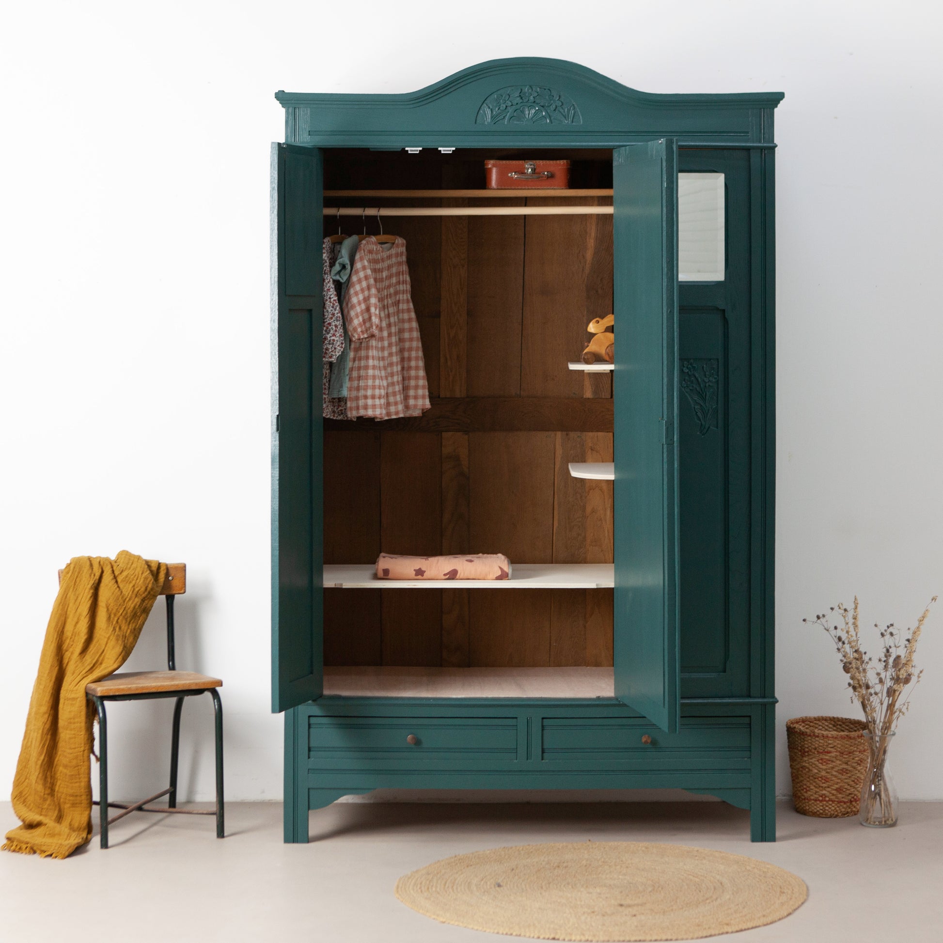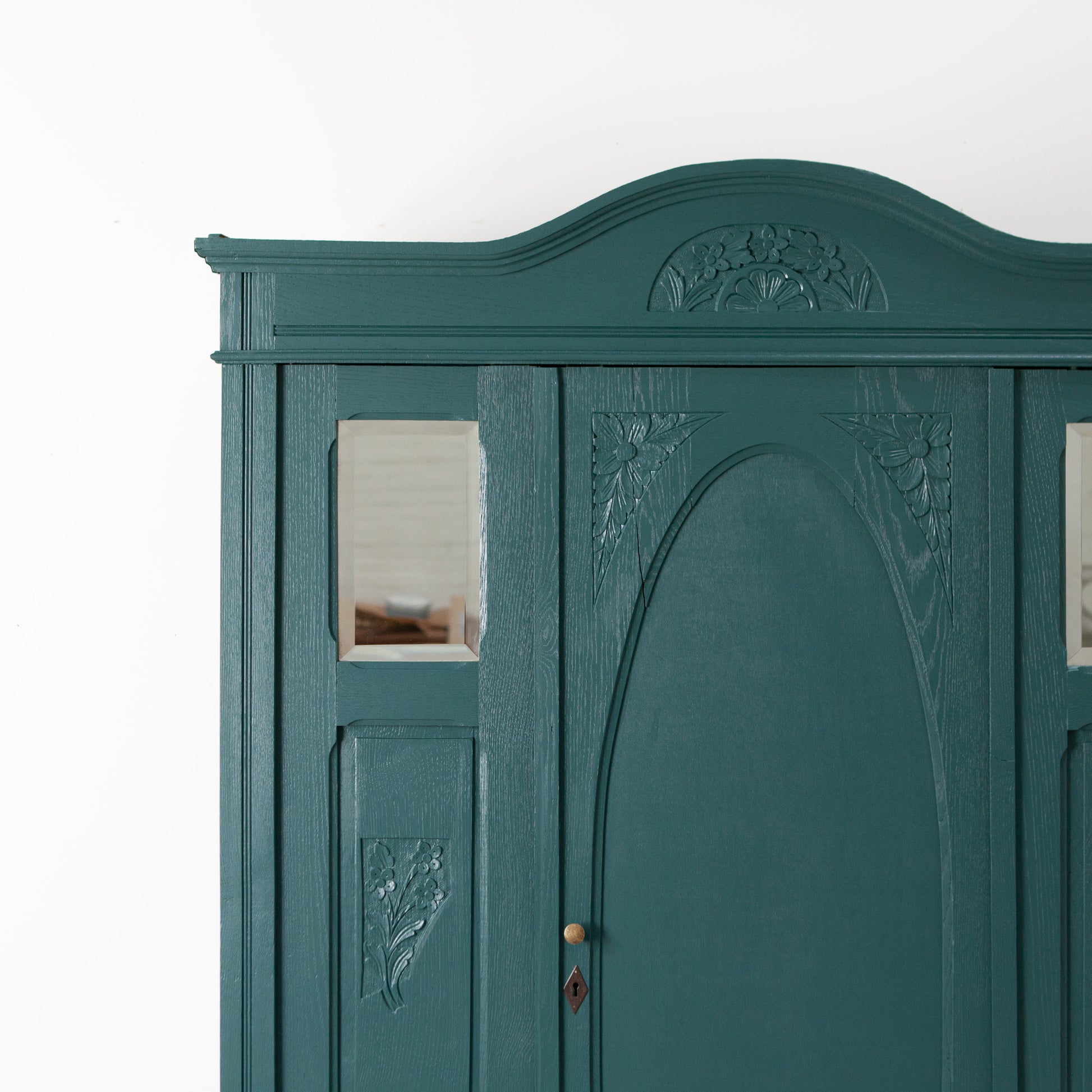 Een grote, mooie, authentieke kast gemaakt van eikenhout. Heel stevig, met fijn houtsnijwerk en facet geslepen spiegeltjes. Prachtig voor op de kinderkamer of slaapkamer.