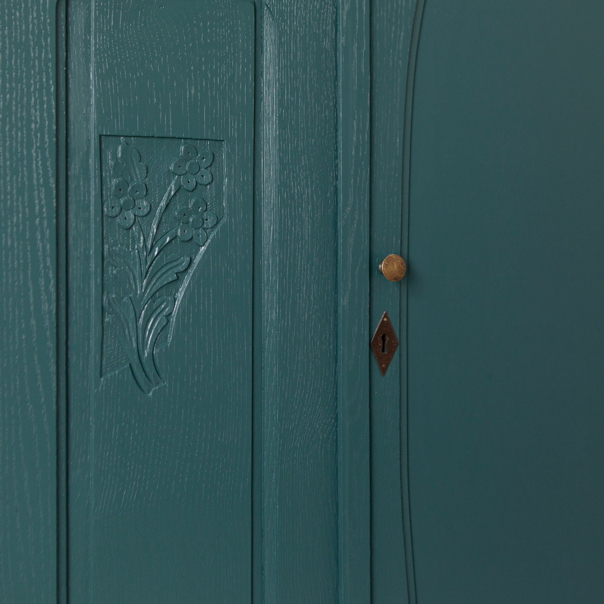 De kast is in onze werkplaats gezandstraald, schoongemaakt en gerepareerd waar nodig. Zo kreeg hij bijvoorbeeld een nieuwe bodemplaat, en gaan de deuren nu weer soepel open en dicht.