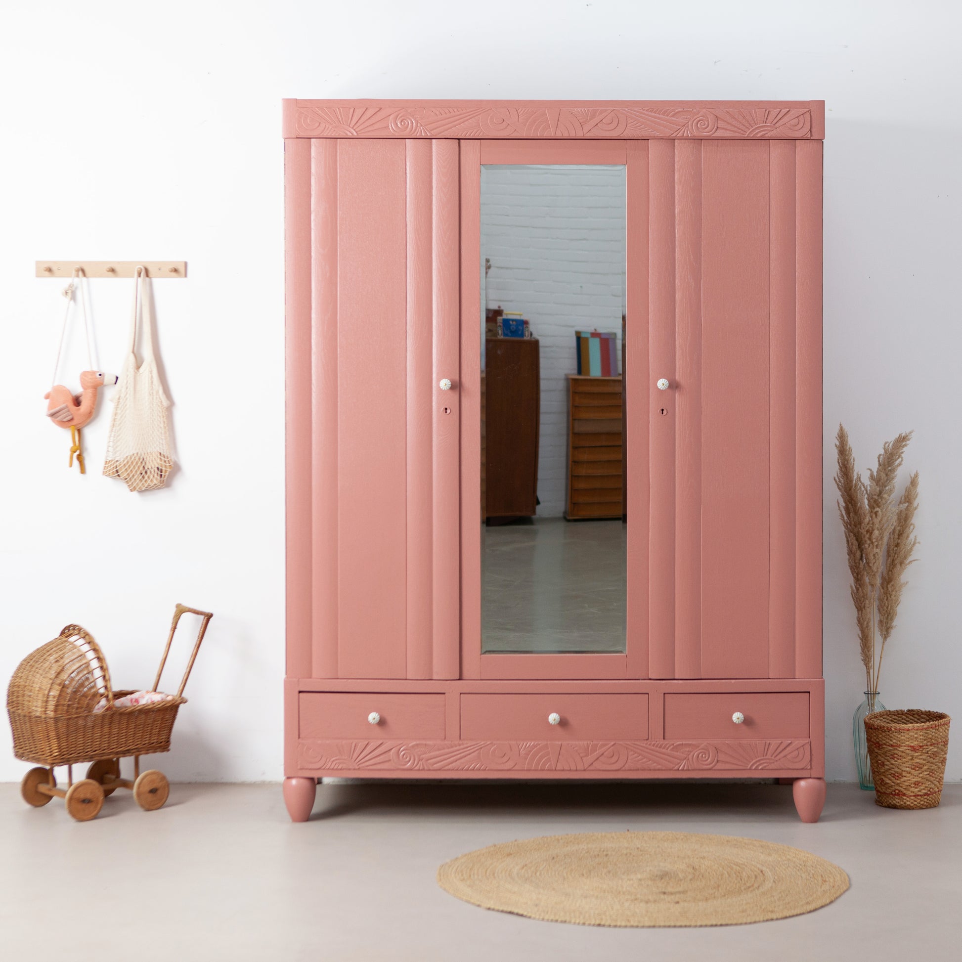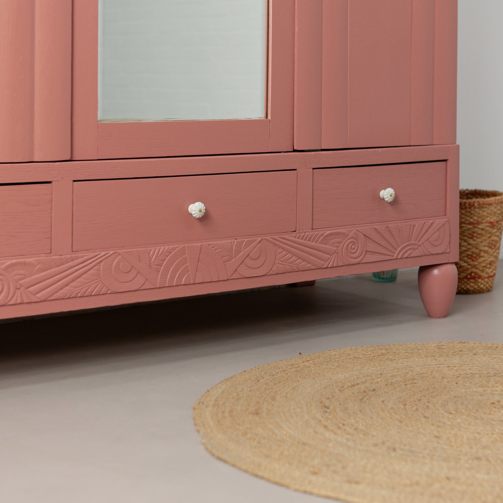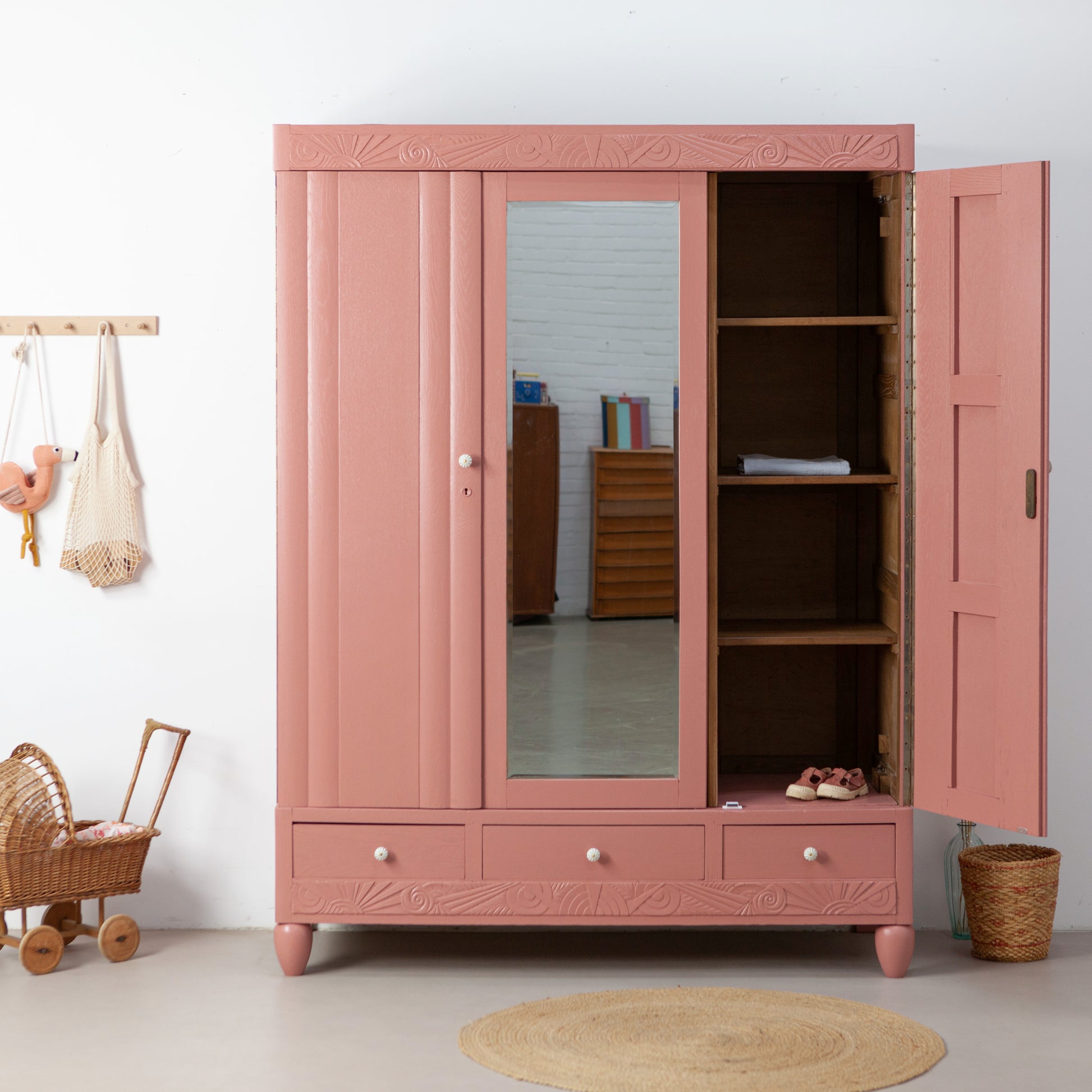Daar hebben we de kast allereerst gezandstraald. Hierdoor gaat alle boenwas er af en begin je weer met kaal hout. Heel fijn, want de verf hecht hierdoor heel goed. Daarna hebben we hem goed schoongemaakt en wat reparaties uitgevoerd. Ook is de kast tegen houtworm behandeld, omdat er toch wat gaatjes te zien waren. Vervolgens hebben we de kast eerst een laag primer gegeven en daarna twee keer afgelakt in deze geweldige roze.