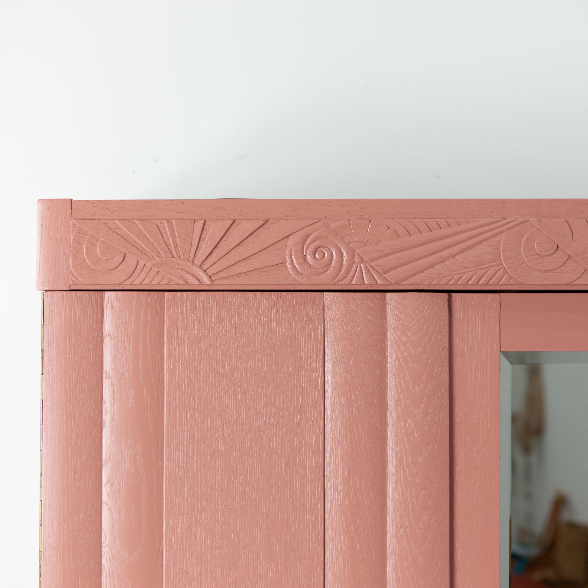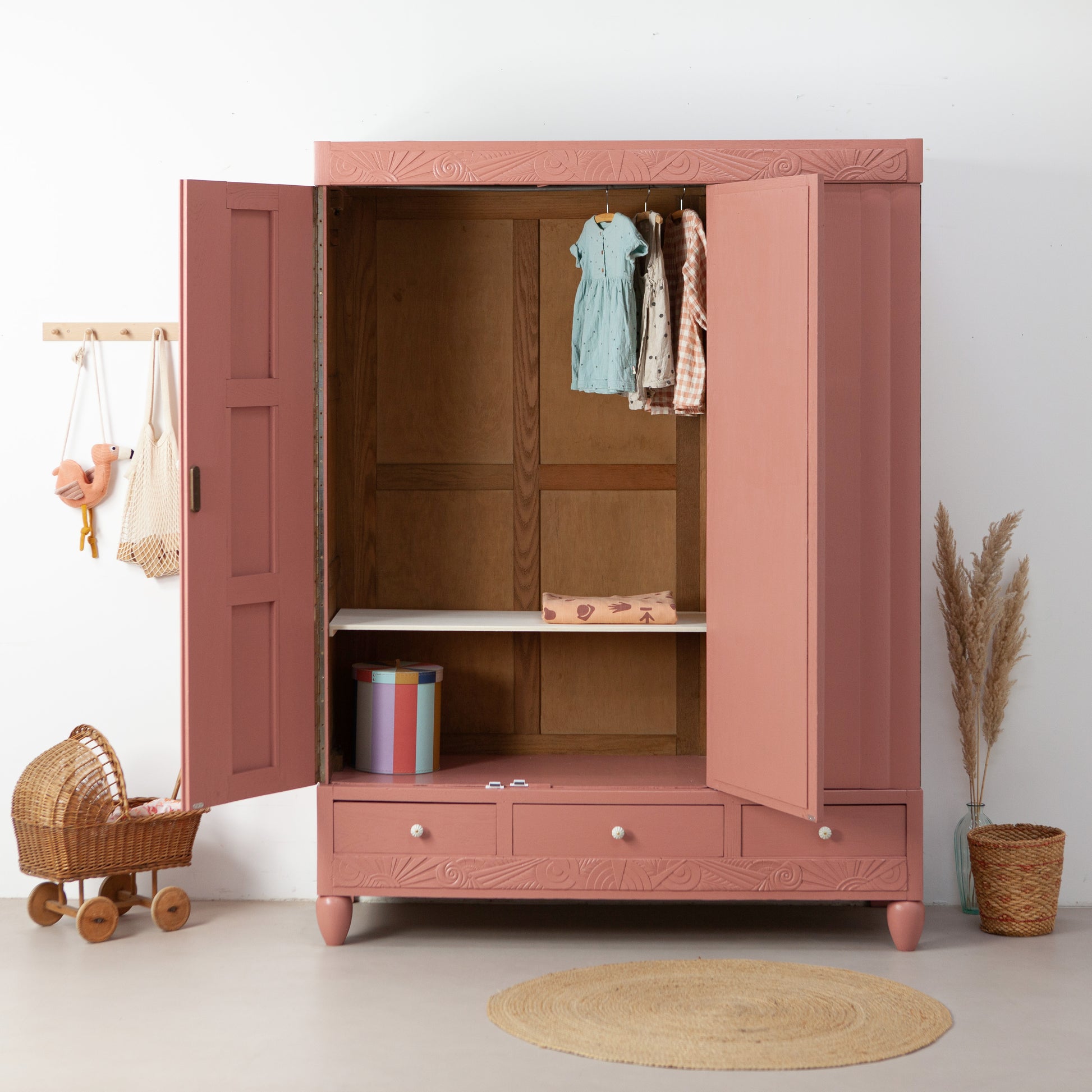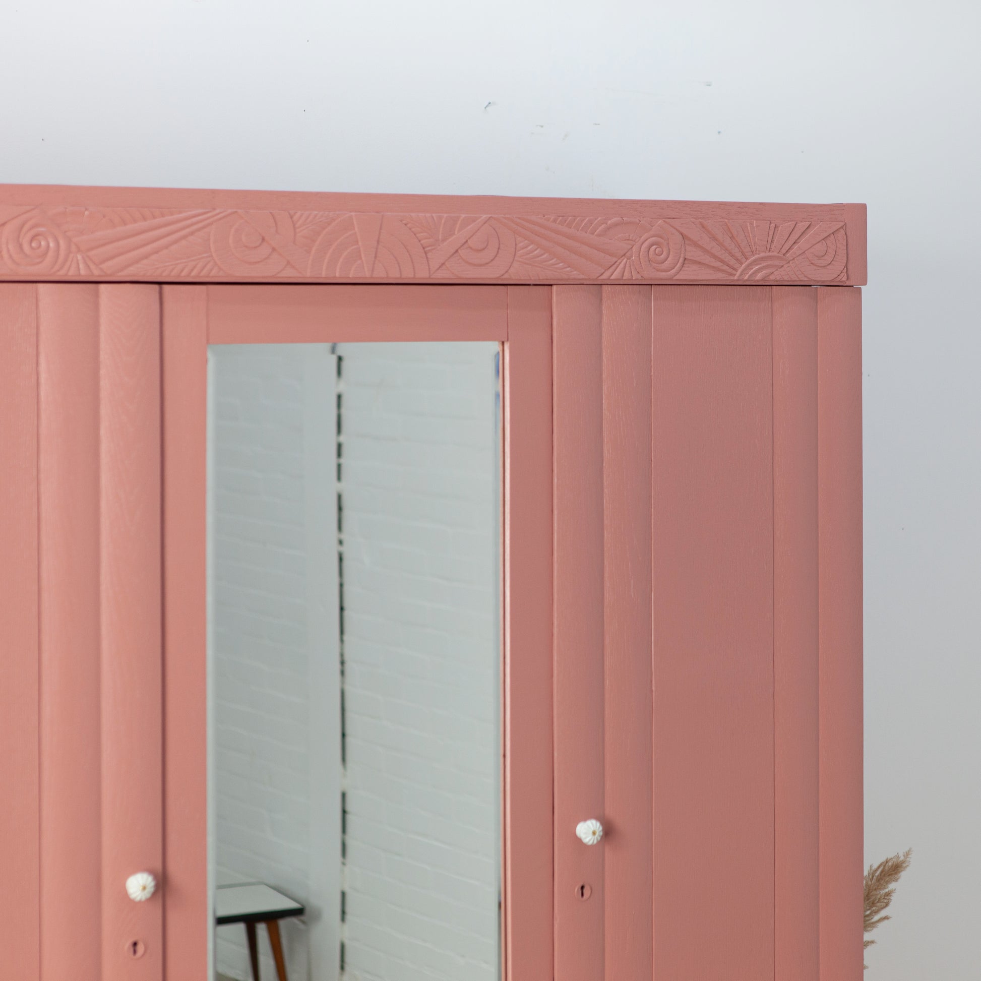 Daar hebben we de kast allereerst gezandstraald. Hierdoor gaat alle boenwas er af en begin je weer met kaal hout. Heel fijn, want de verf hecht hierdoor heel goed. Daarna hebben we hem goed schoongemaakt en wat reparaties uitgevoerd. Ook is de kast tegen houtworm behandeld, omdat er toch wat gaatjes te zien waren. Vervolgens hebben we de kast eerst een laag primer gegeven en daarna twee keer afgelakt in deze geweldige roze.