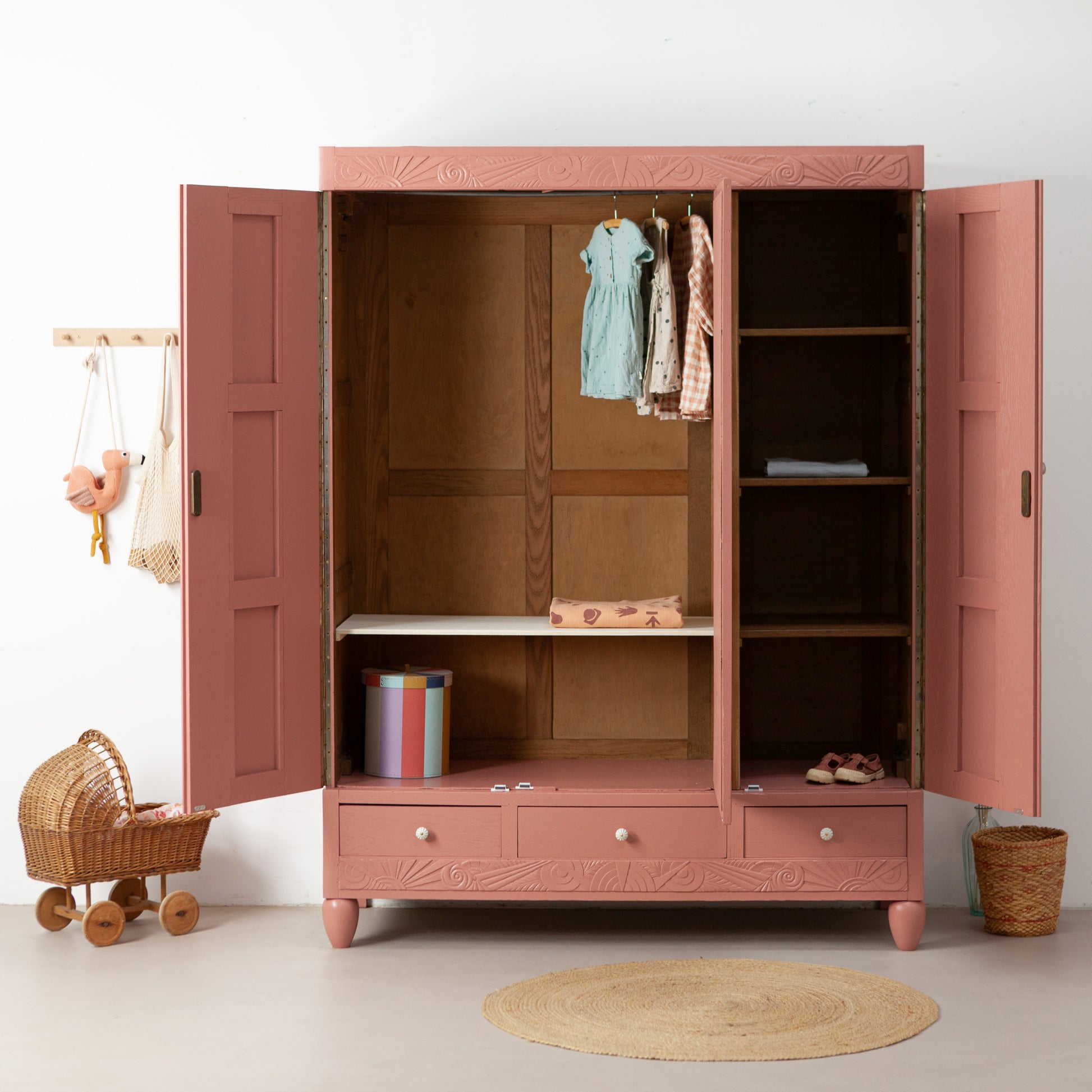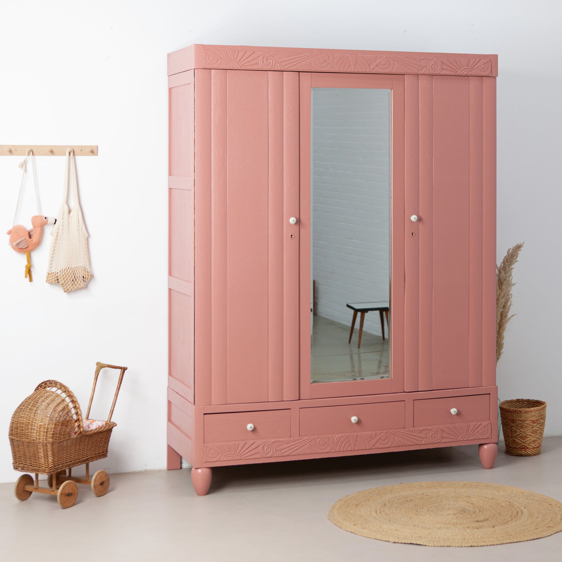 prachtig houtsnijwerk, sierlijke details, een originele facet geslepen spiegel en gemaakt van eikenhout. Wat zijn dit soort kasten toch perfect voor op de kinderkamer!