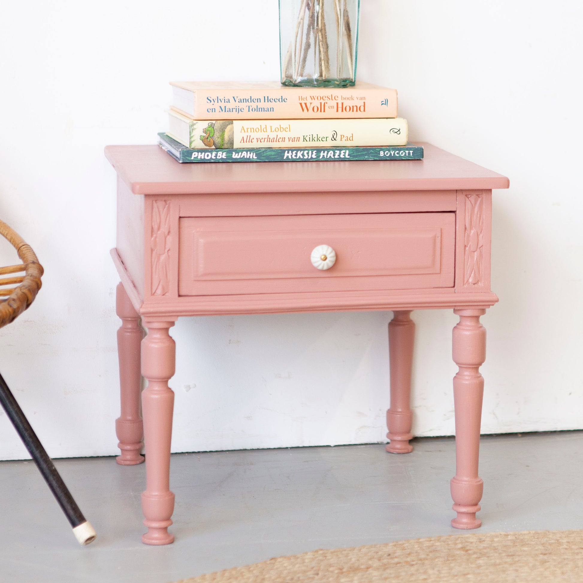 Een bijzonder nachtkastje / bijzettafeltje uit Frankrijk, wat een liefje! Met een klein laatje en aan weerszijden een uit het hout gesneden bloemetje.