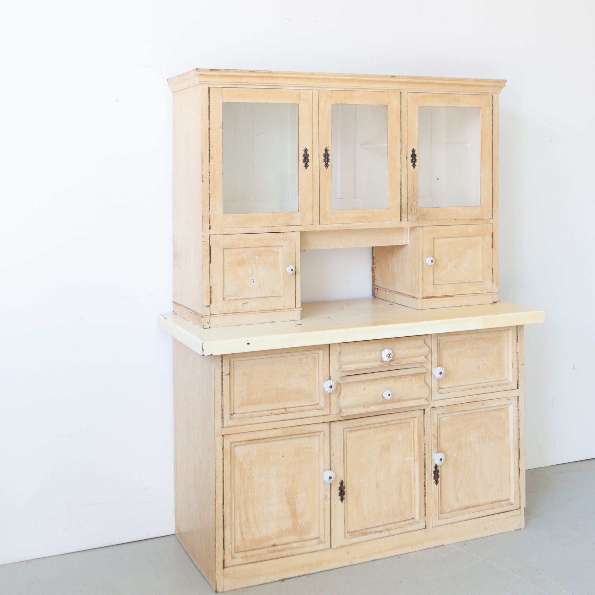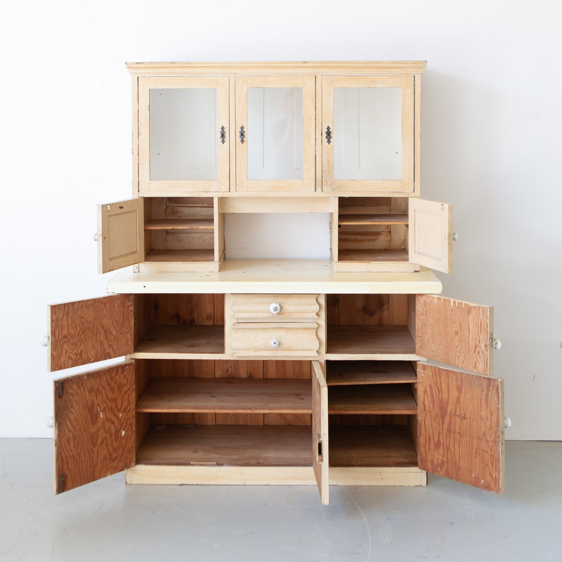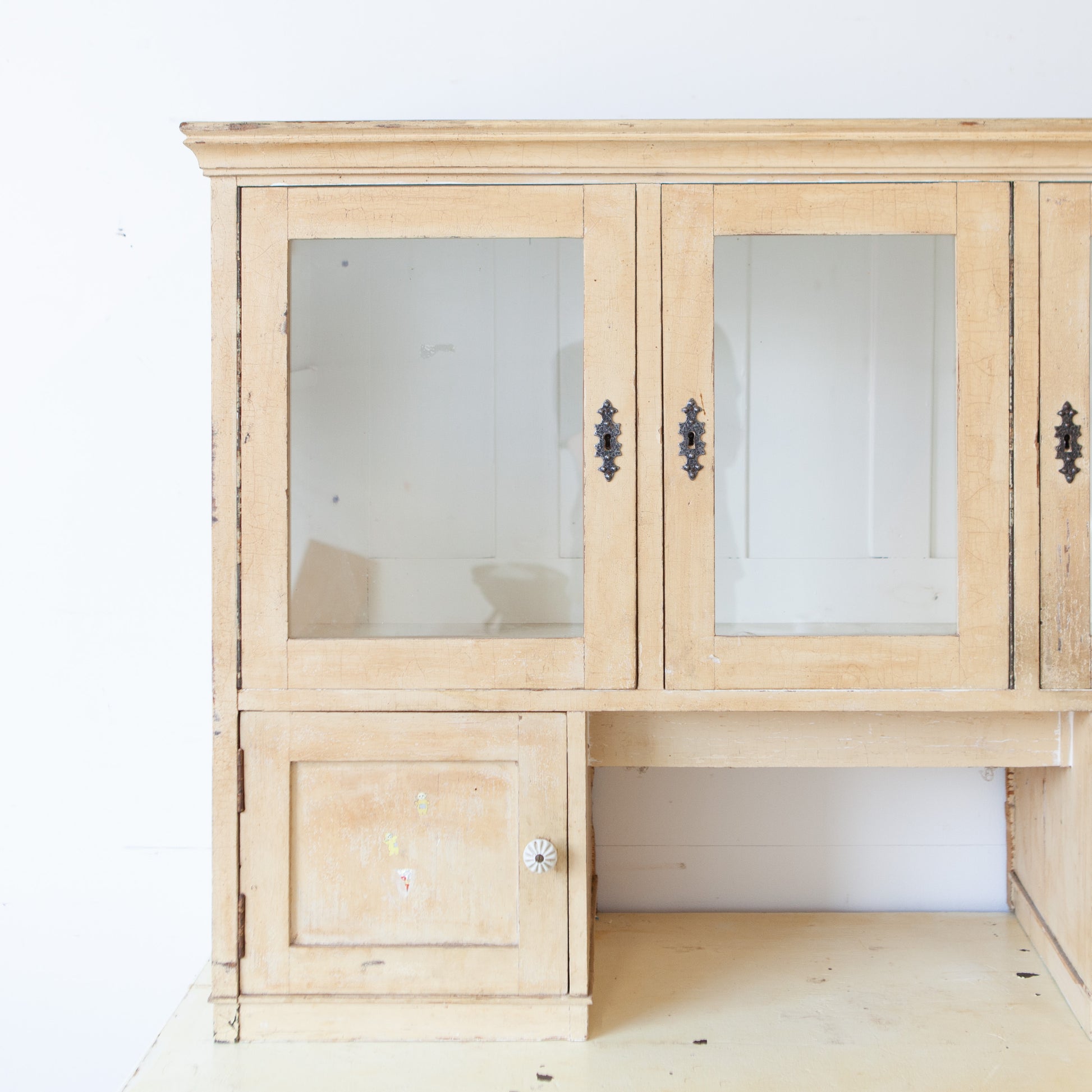 De kast zal eerst worden gezandstraald, zodat alle oude lagen lak verwijderd worden. Ook zal de kast (preventief) tegen houtworm behandeld worden waarna we hem heel goed schoon maken. Waar nodig voeren we reparaties uit of vervangen we onderdelen. Zo heeft de kast op dit moment geen pootjes die we er nieuw op zullen plaatsen. Hierbij kan gekozen worden uit schuine retro pootjes of bolpootjes. Ook zal er in het bovenste compartiment, achter de ruitjes, een plankje worden geplaatst. Na alle reparaties is de kast weer helemaal goed en stevig, gaan de deuren soepel open en dicht en klemmen de lades niet.
