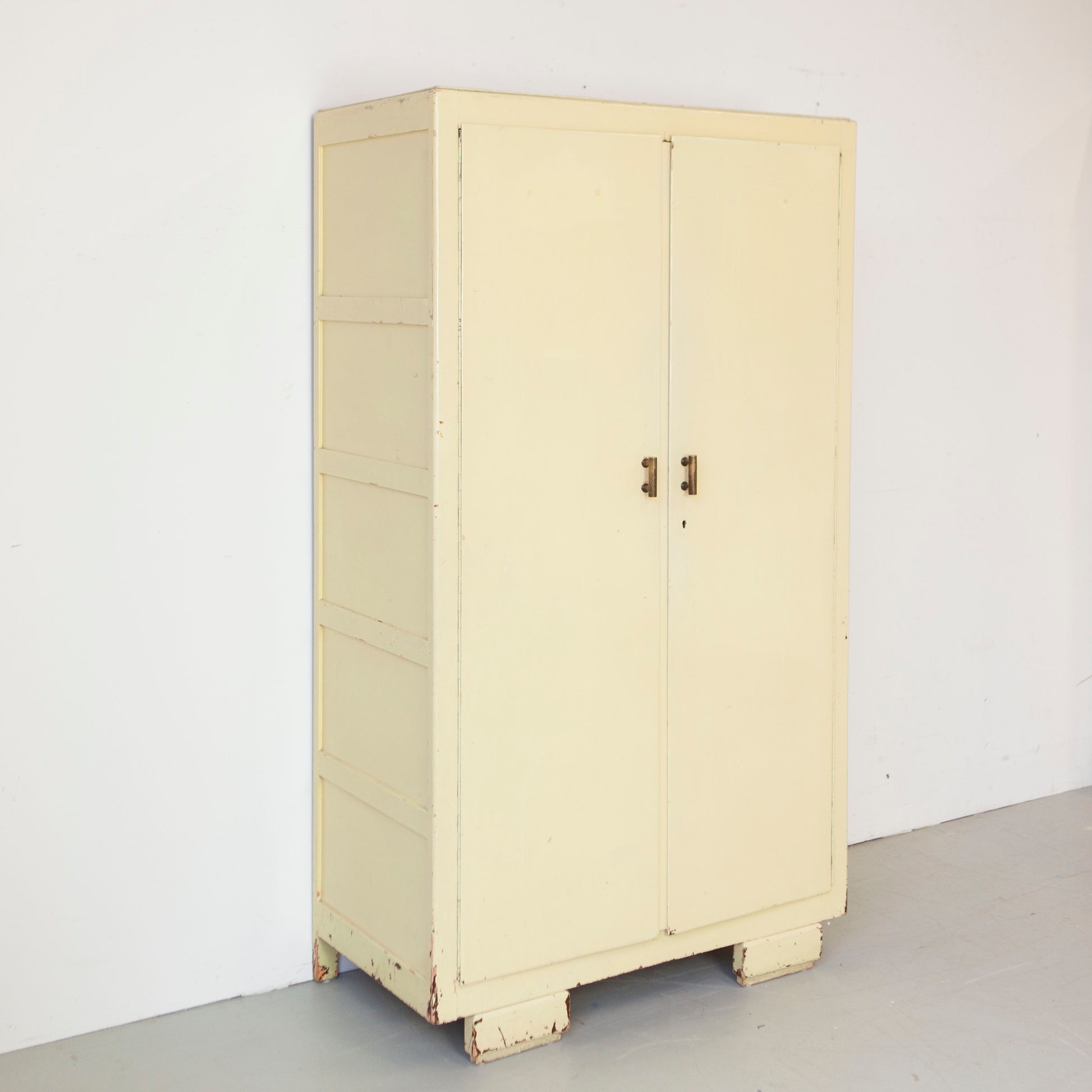 De linkerdeur sluit met een schuifje en op de rechterdeur zullen we een mageneetje plaatsen. De kast heeft originele greepjes die we terug kunnen terugplaatsen. Ook is het natuurlijk mogelijk de plaatjes te vervangen voor een nieuwe, we hebben altijd meerdere opties op voorraad. Dat geldt ook voor het nu nog ontbrekende sleutelplaatje.
