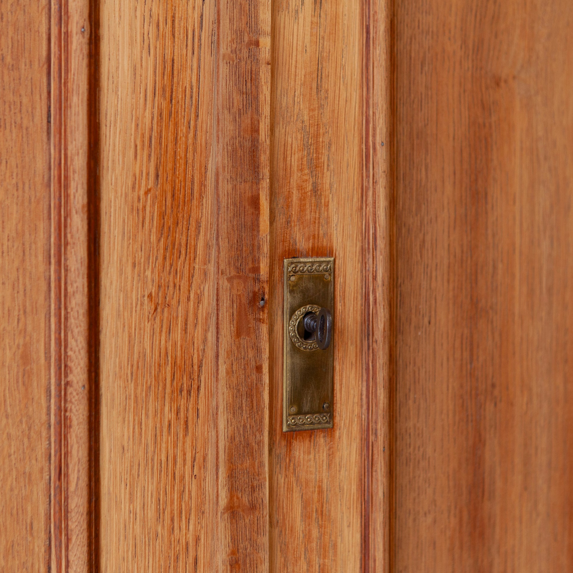De linkerdeur sluit met een houten schuif en de rechterdeur beschikt over een werkend slot met sleutel. De kast heeft een origineel sleutelplaatje wat we, eventueleel meegeschilderd, kunnen terugplaatsen. Ook is het natuurlijk mogelijk het plaatje te vervangen voor een nieuwe, we hebben altijd meerdere opties op voorraad.