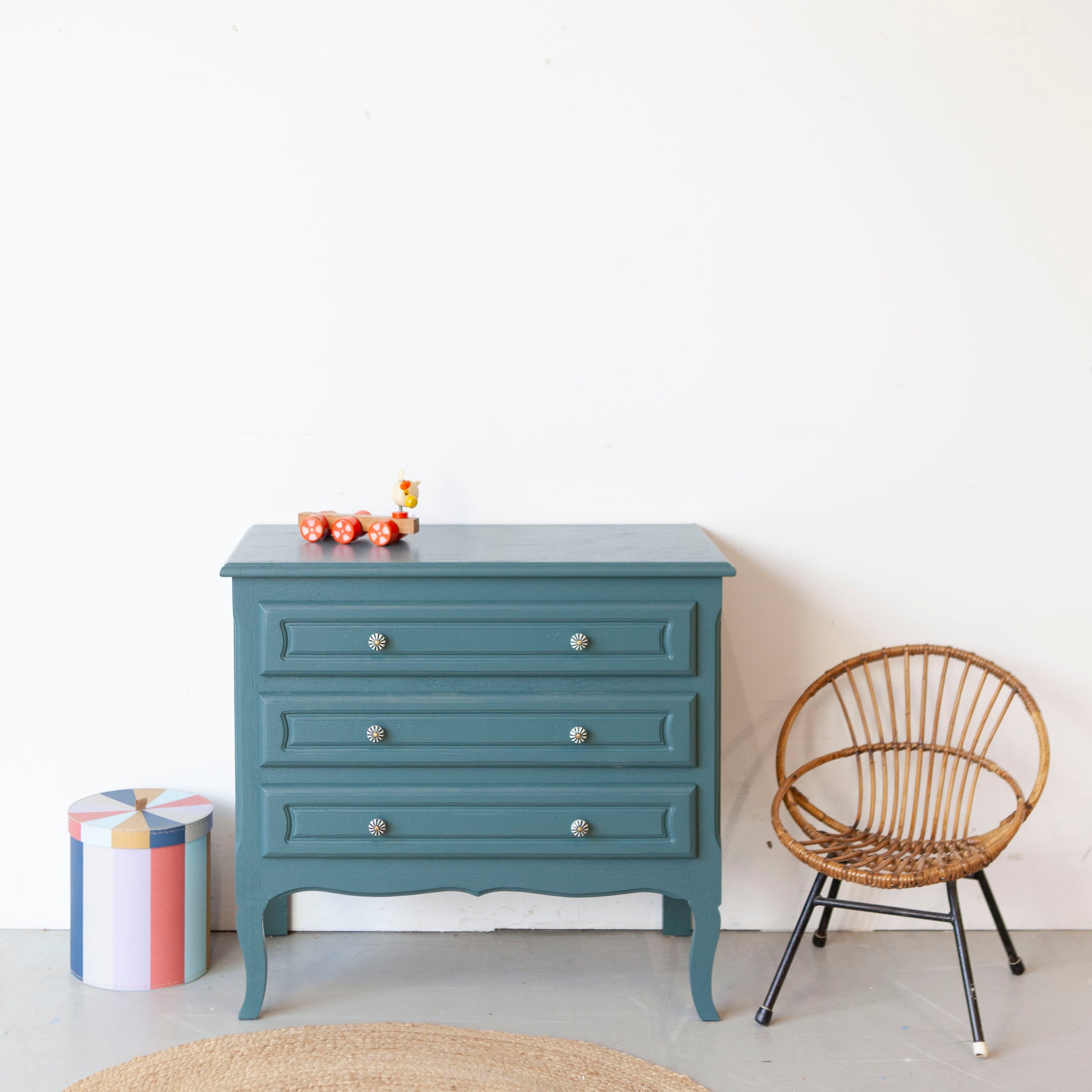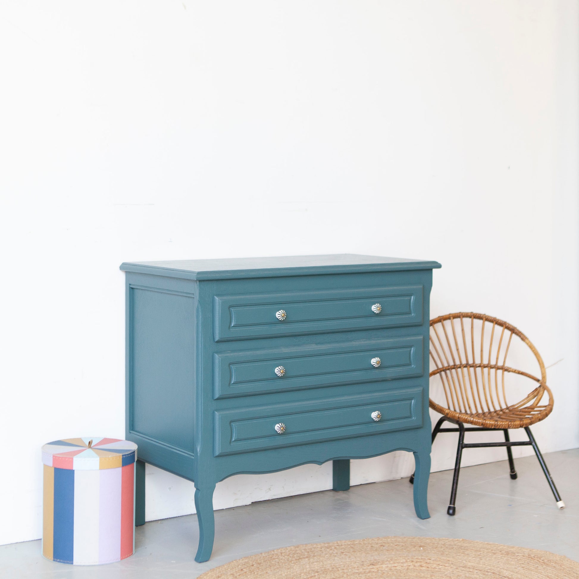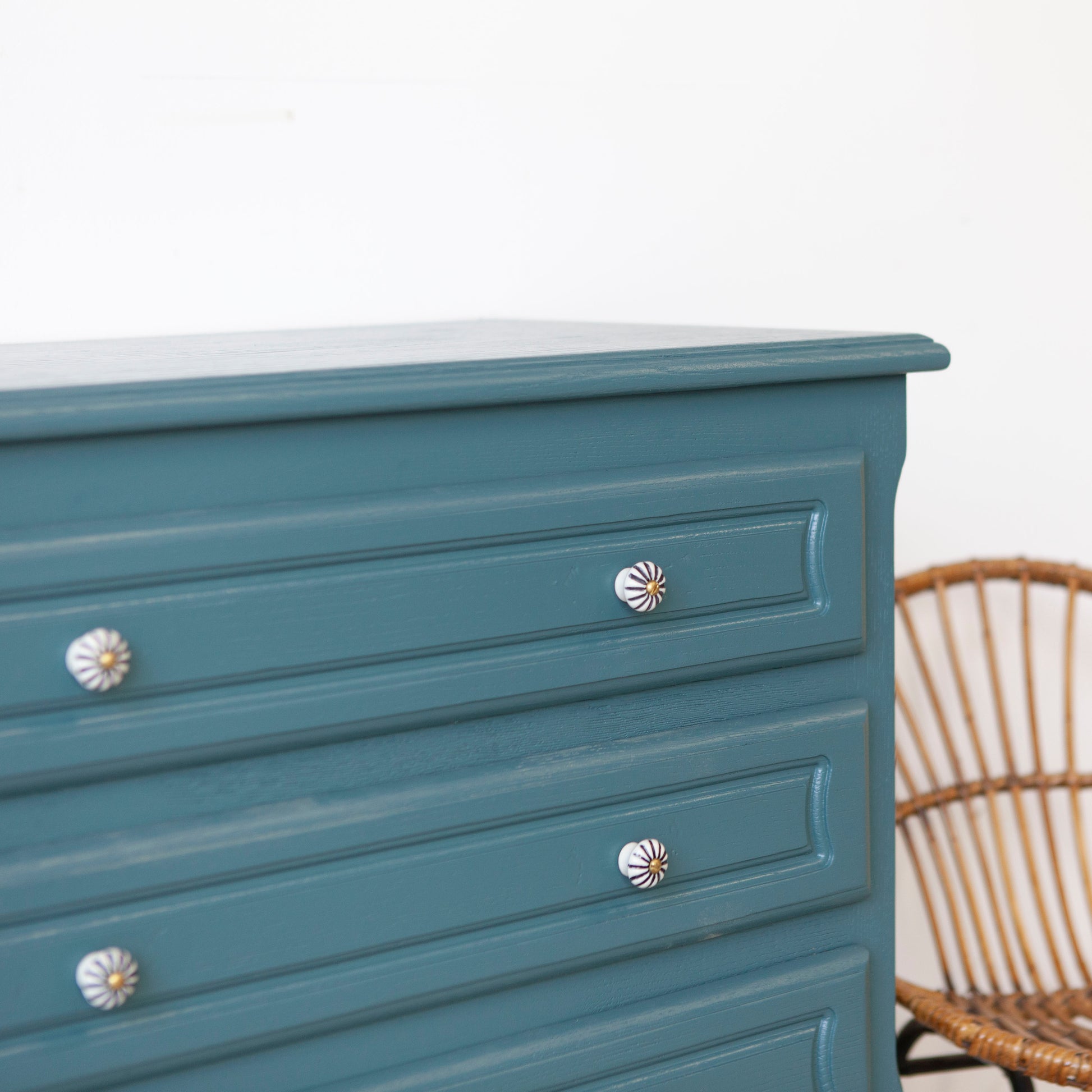 We hebben ervoor gekozen om hem te schilderen in deze blauw, een prachtige kleur. En met de gestreepte porseleinen knopjes is dit lieve kastje nu helemaal af.
