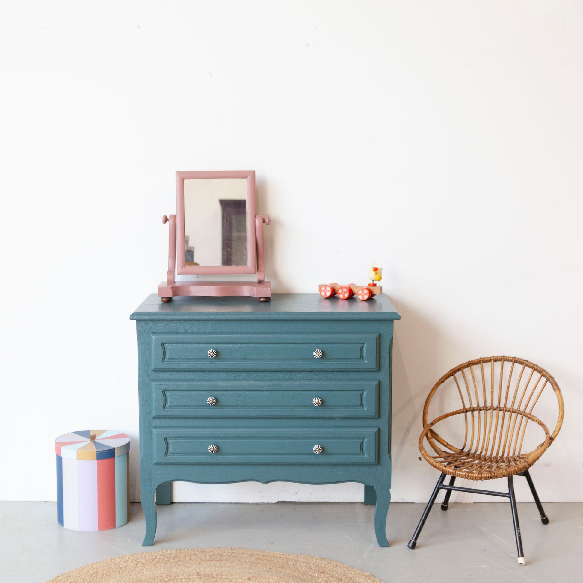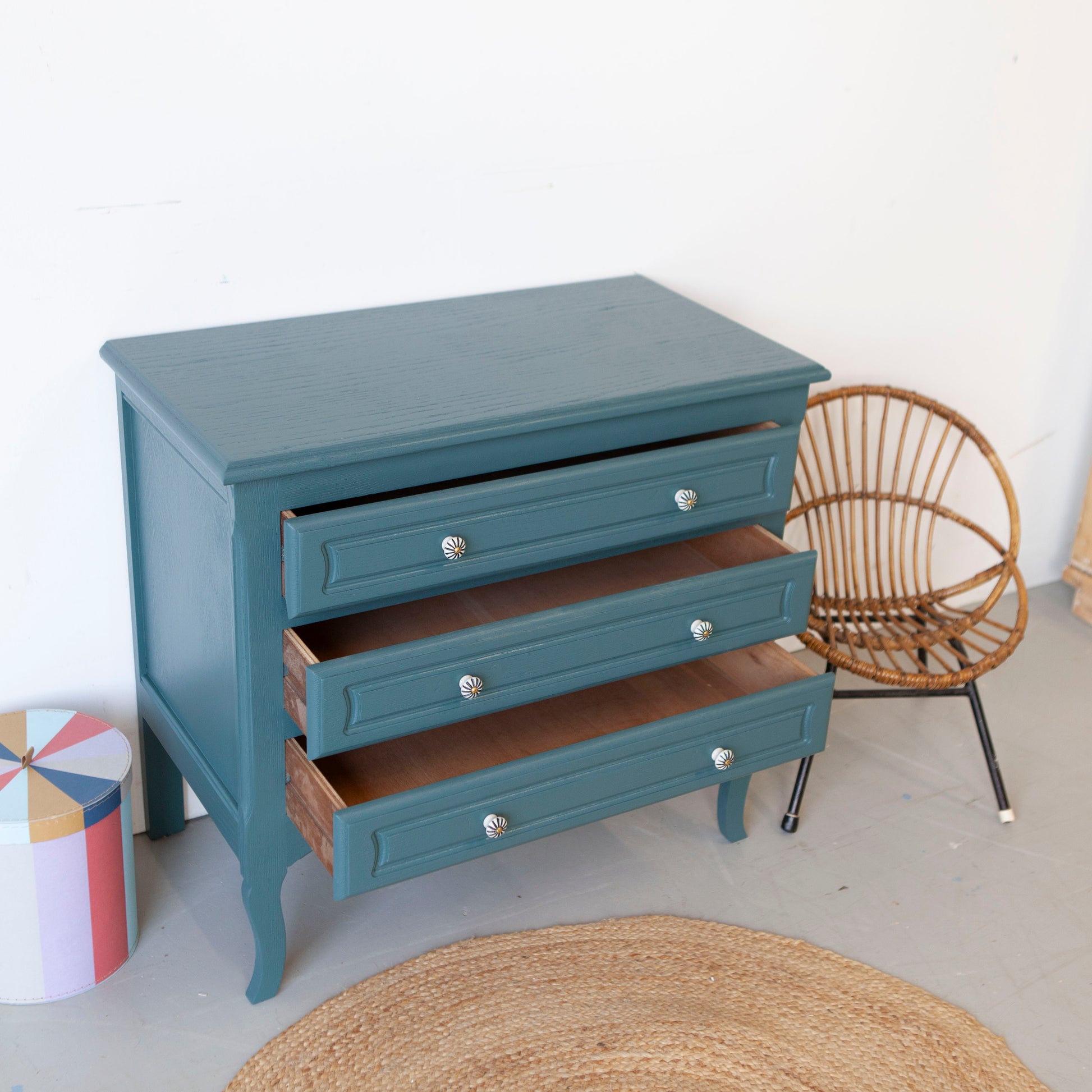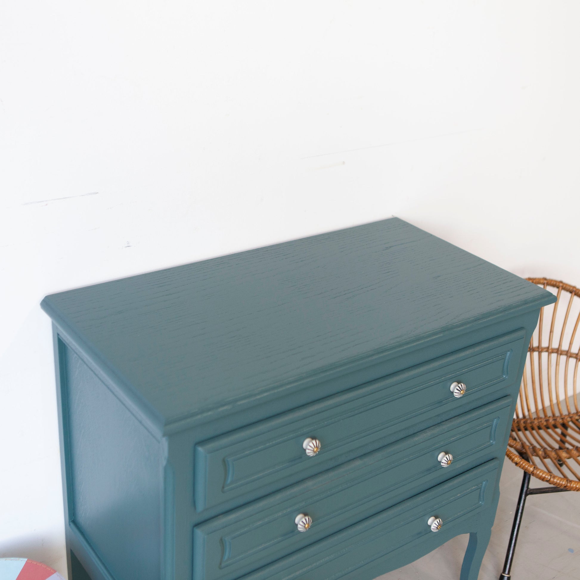 We hebben ervoor gekozen om hem te schilderen in deze blauw, een prachtige kleur. En met de gestreepte porseleinen knopjes is dit lieve kastje nu helemaal af.