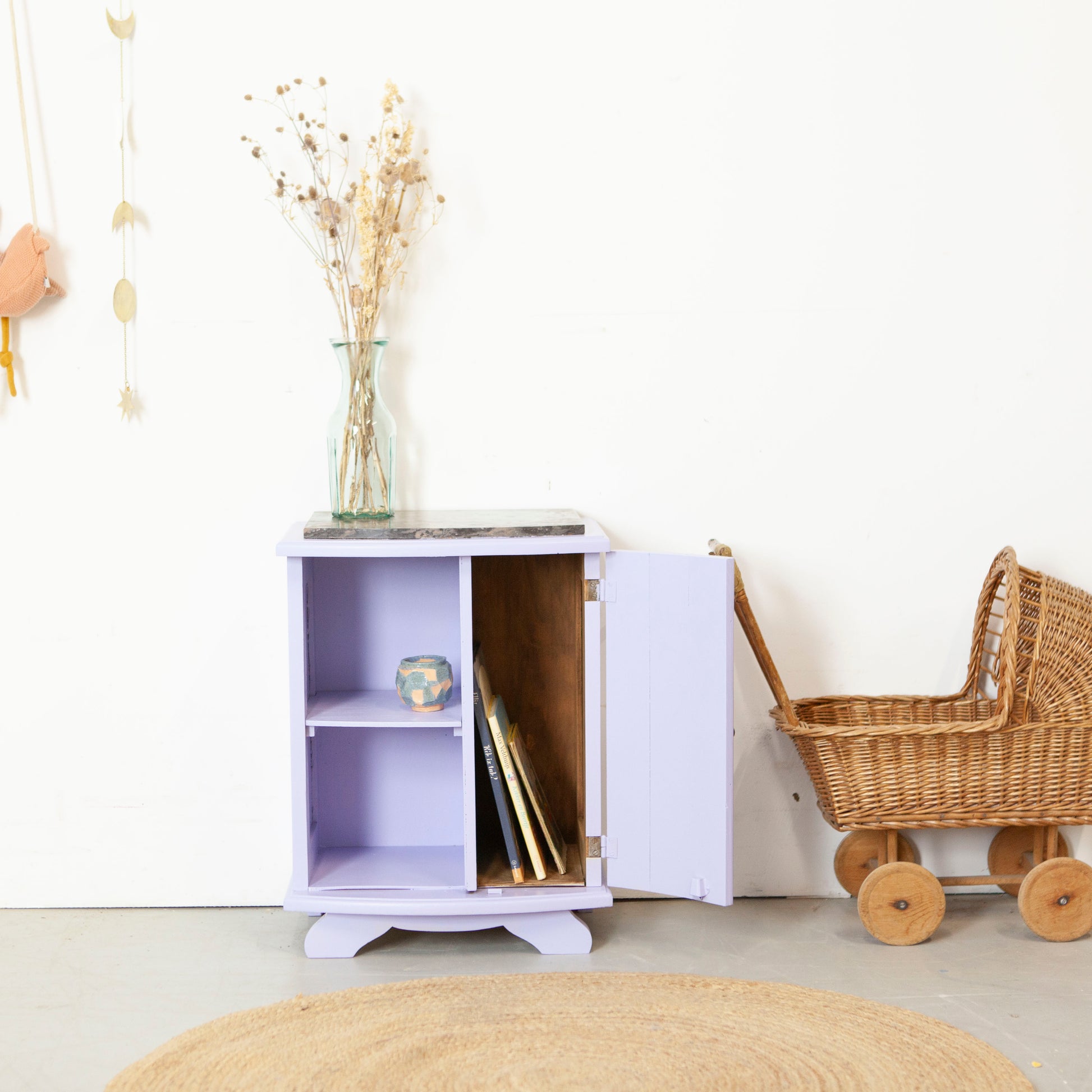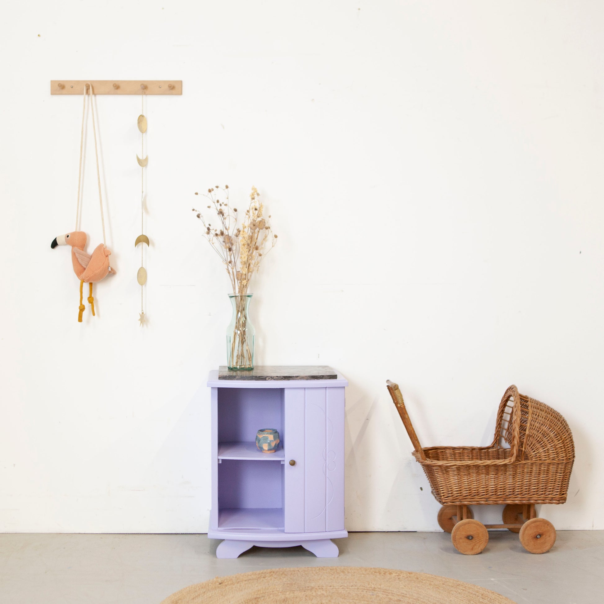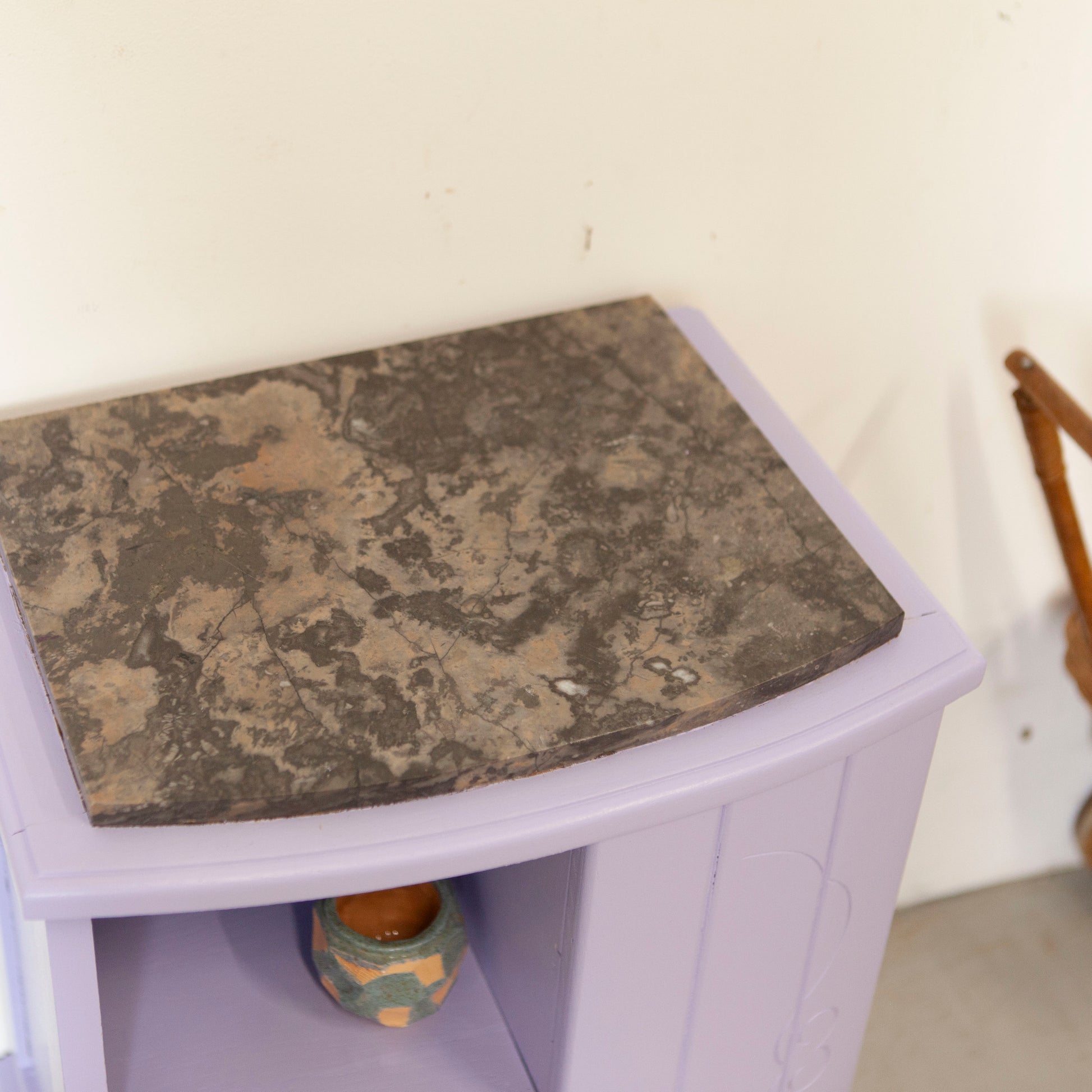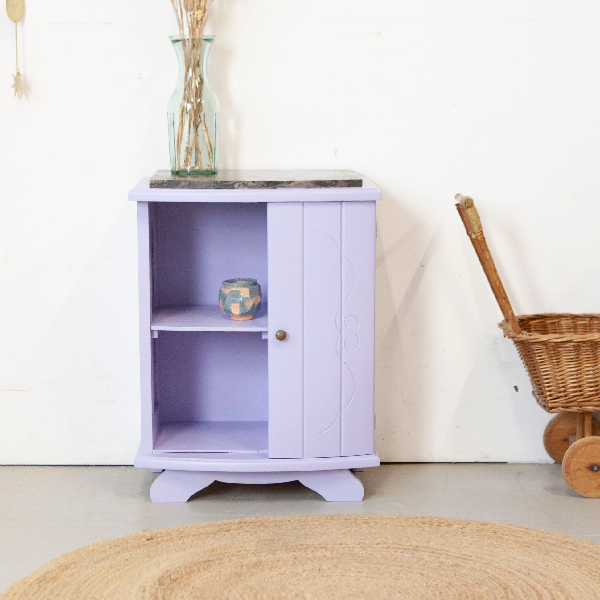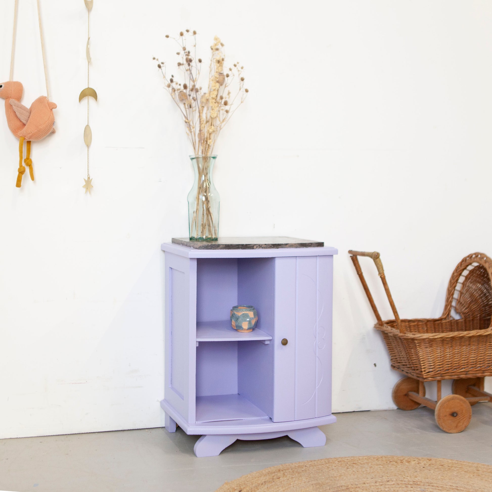 We hebben hem in onze werkplaats gezandstraald, nagelopen en in deze heerlijke lavendel geschilderd. Een mooie combinatie met het marmeren blad.