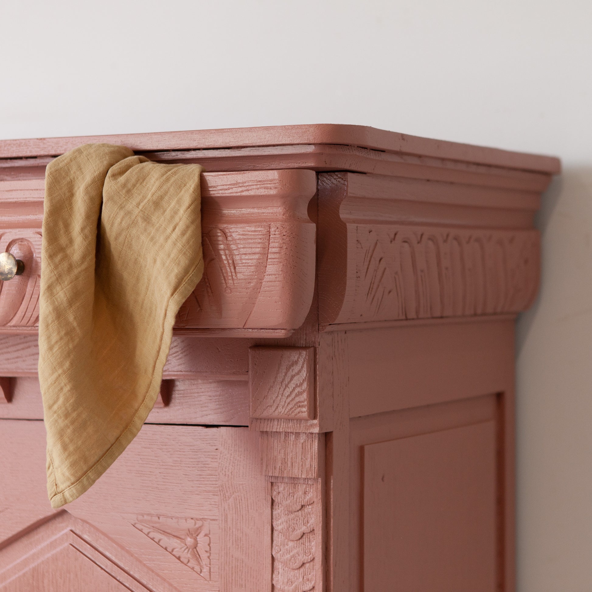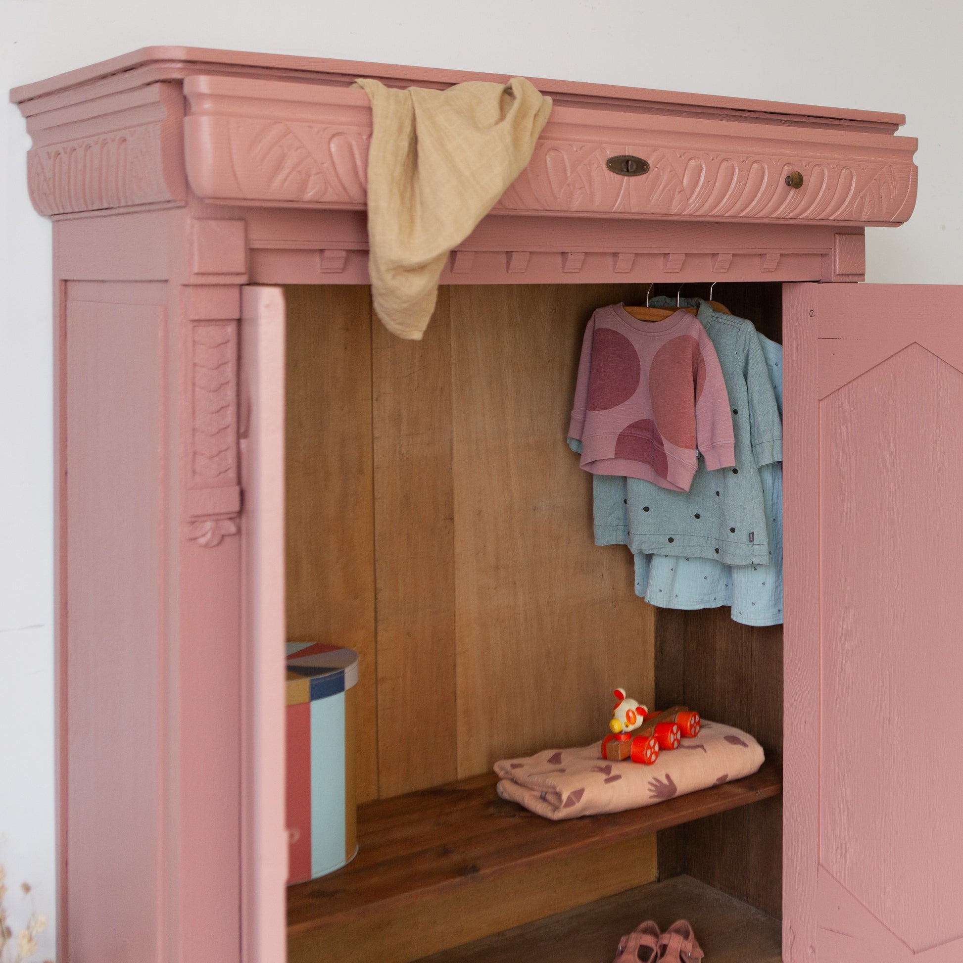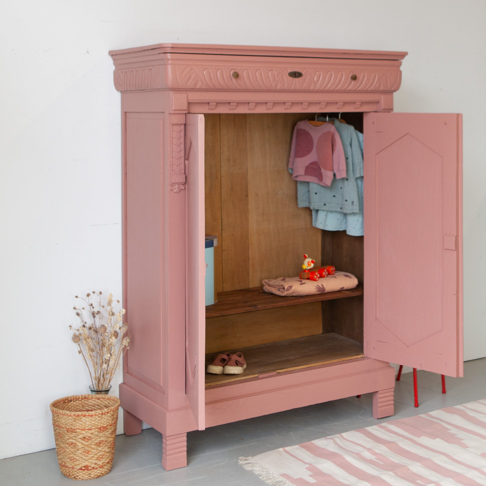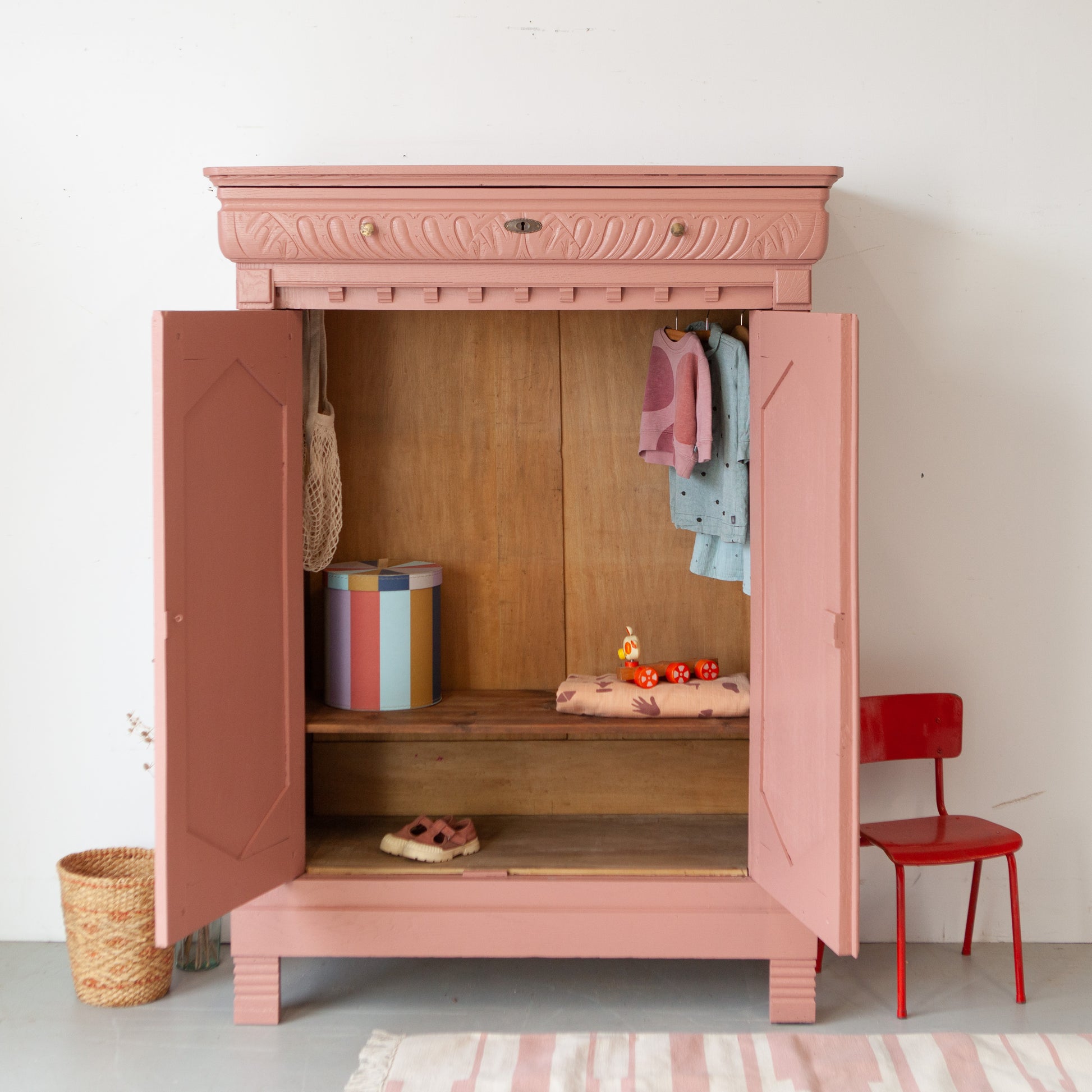 Daarna hebben we de kast geschilderd. Eerst kreeg hij een laag primer en daarna 2 lagen lak. We gebruiken altijd een professionele, kindvriendelijke, verf op waterbasis. De kleur die we voor deze kast hebben uitgekozen is een unieke, zachte roze, met een warme ondertoon.