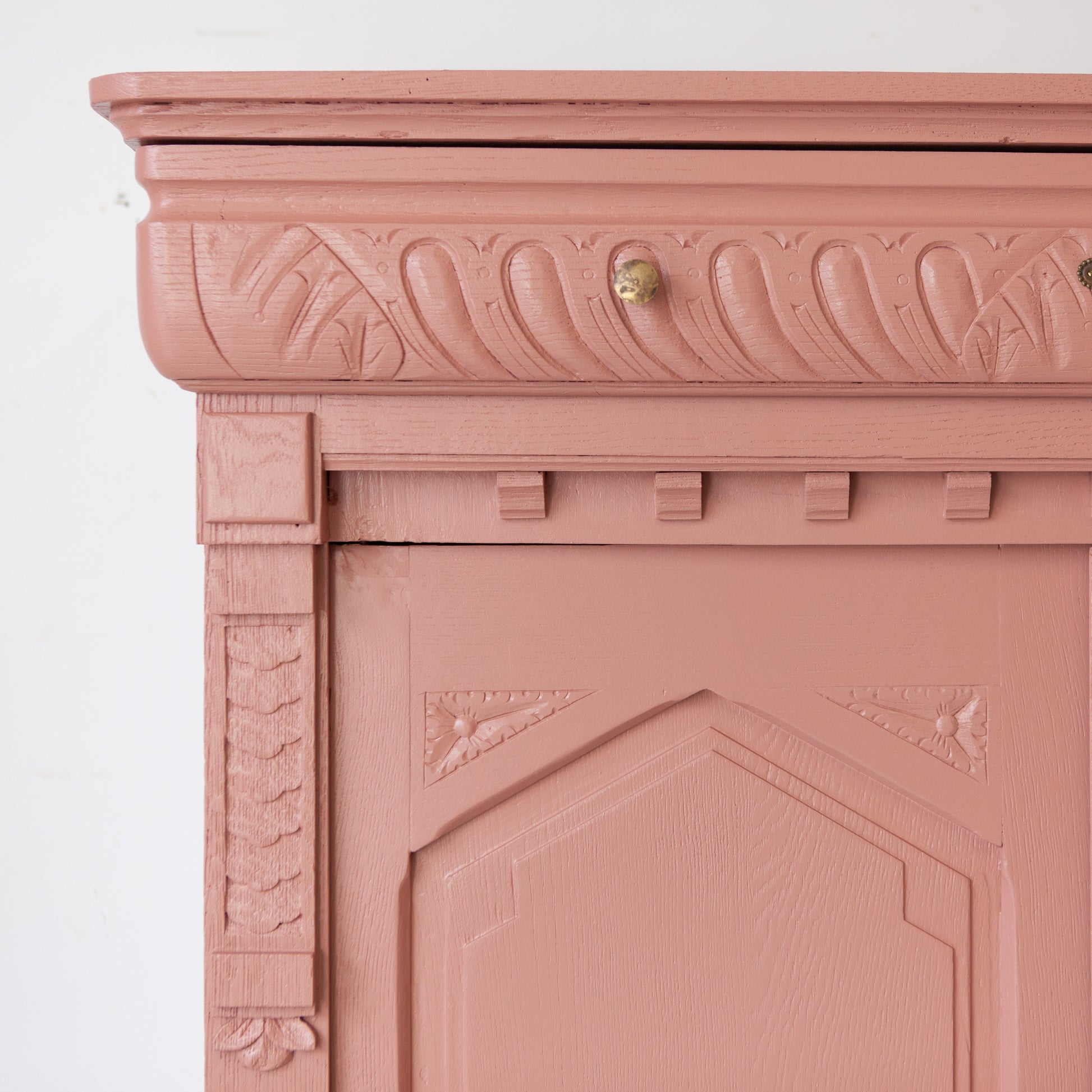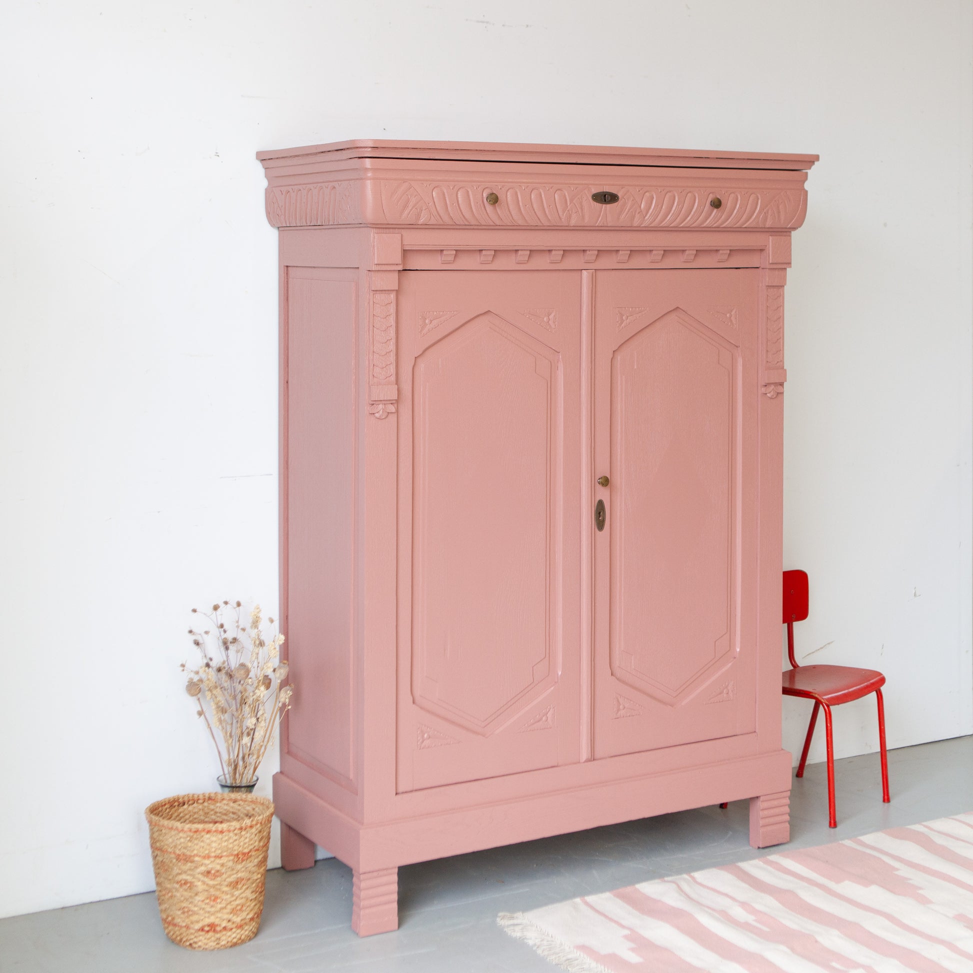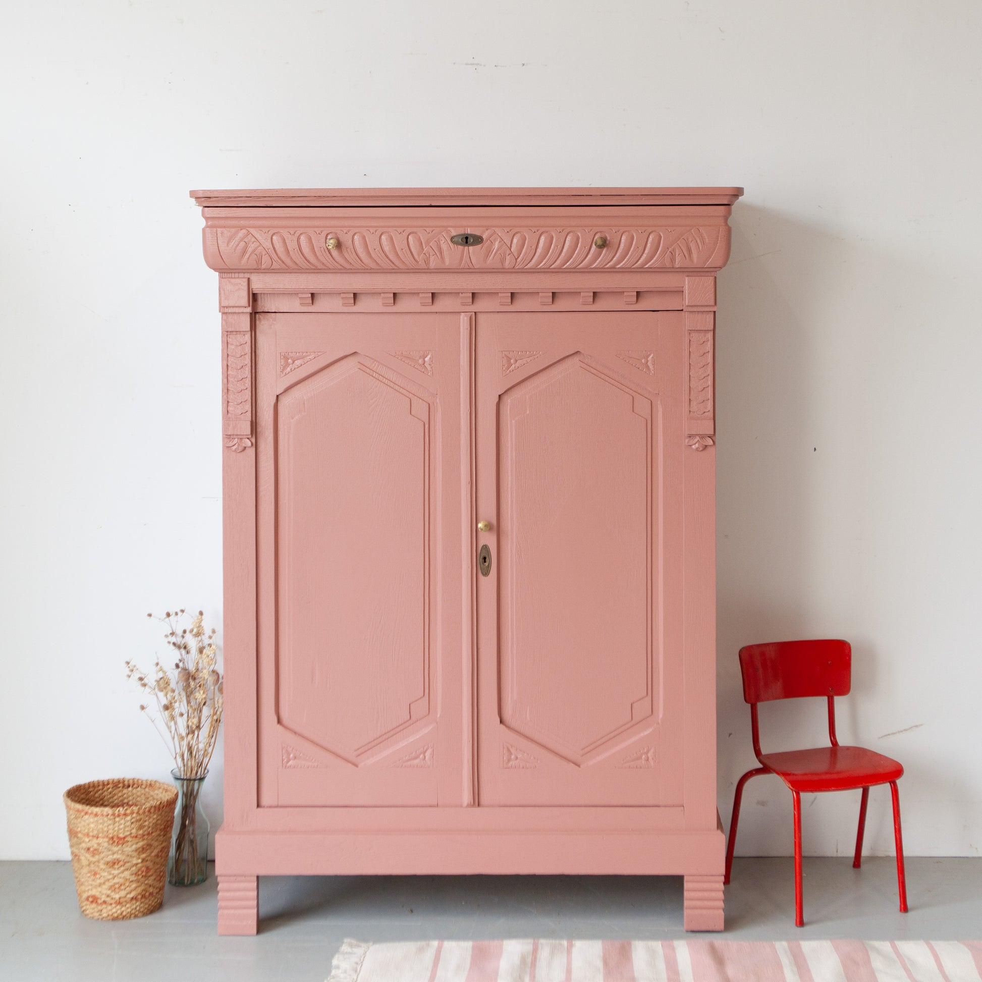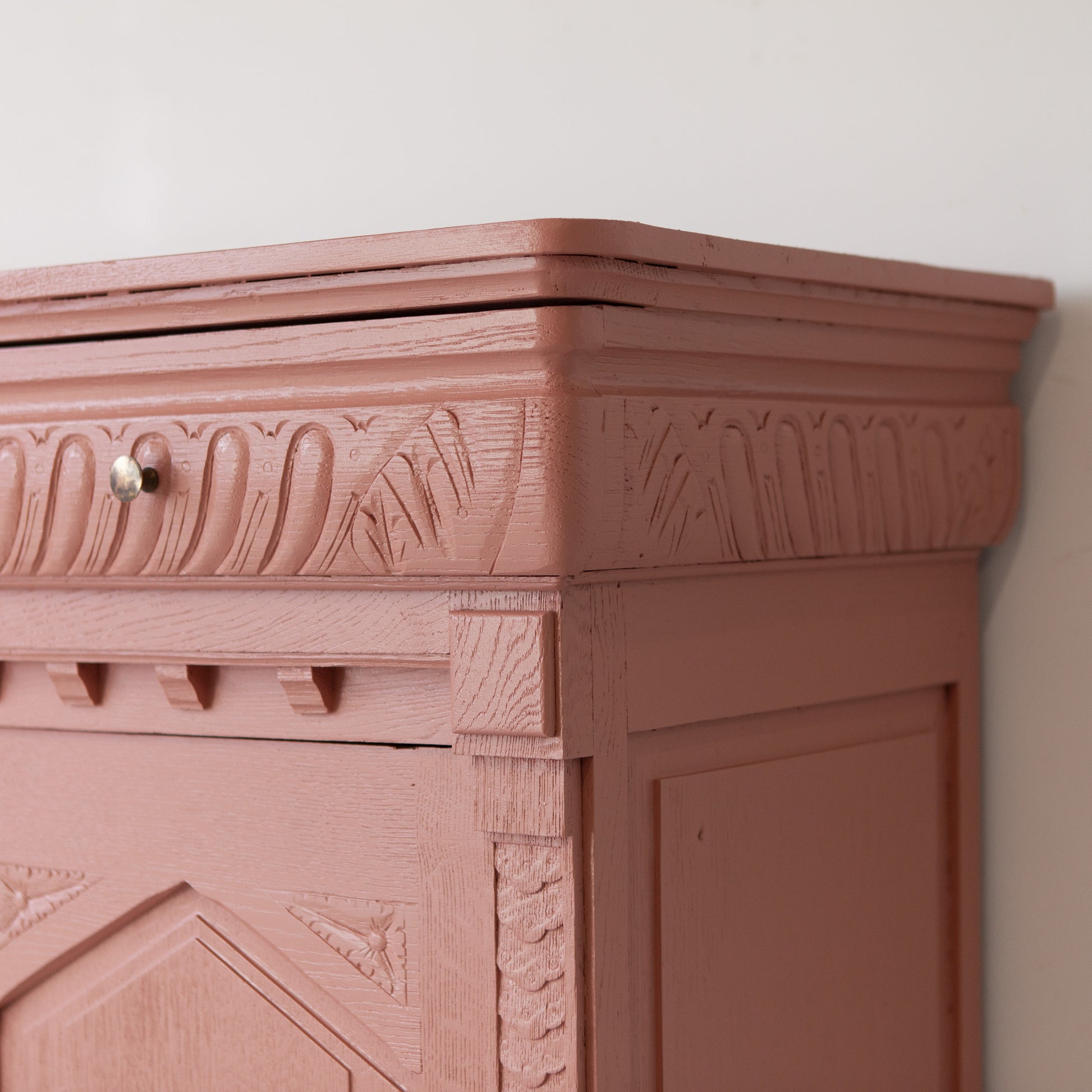 Daarna hebben we de kast geschilderd. Eerst kreeg hij een laag primer en daarna 2 lagen lak. We gebruiken altijd een professionele, kindvriendelijke, verf op waterbasis. De kleur die we voor deze kast hebben uitgekozen is een unieke, zachte roze, met een warme ondertoon.