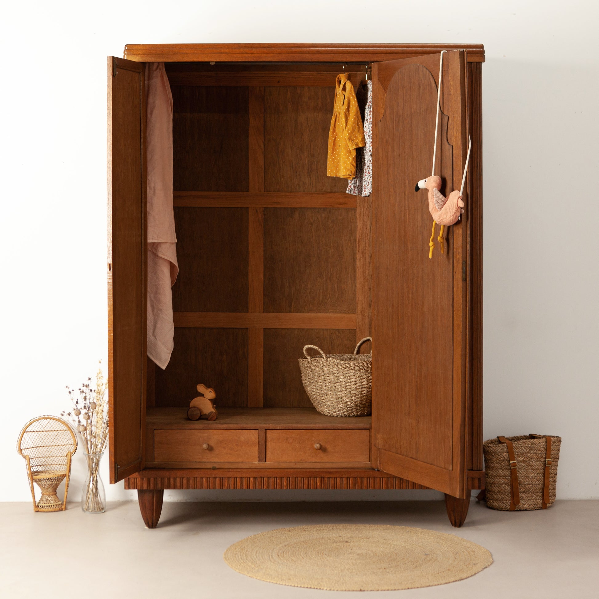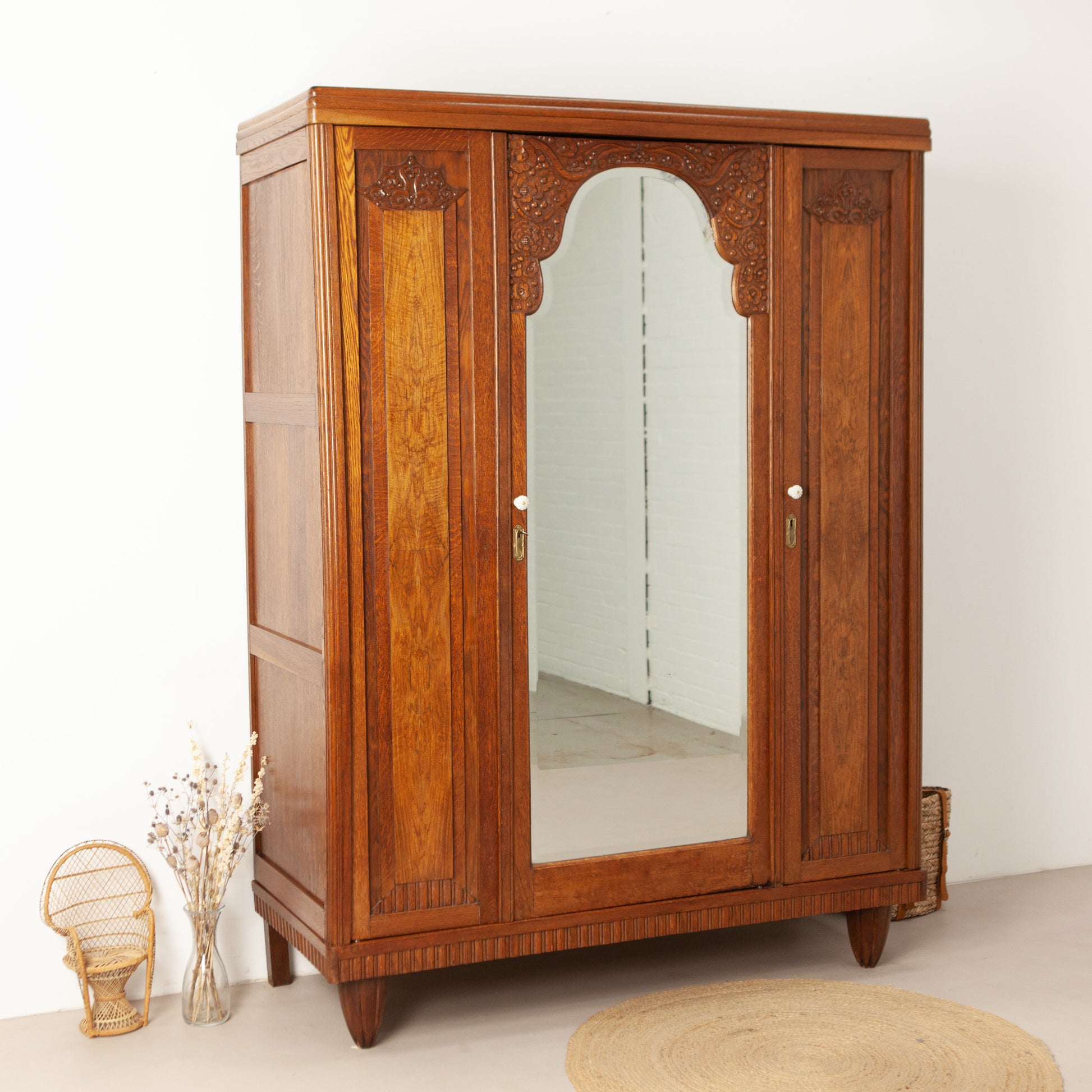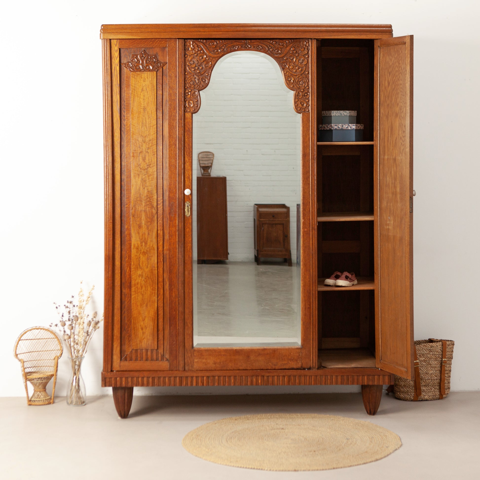 De kast heeft drie deuren en een verrassende binnenkant. Achter de linkerdeur zit een compartiment met 3 originele massief houten plankjes, die in hoogte verstelbaar zijn. Achter de linker- en de grote spiegeldeur zit een brede roede, en 2 ruime lades. Hierdoor is er meer dan genoeg ruimte om alle kleding en andere spullen in op te bergen.