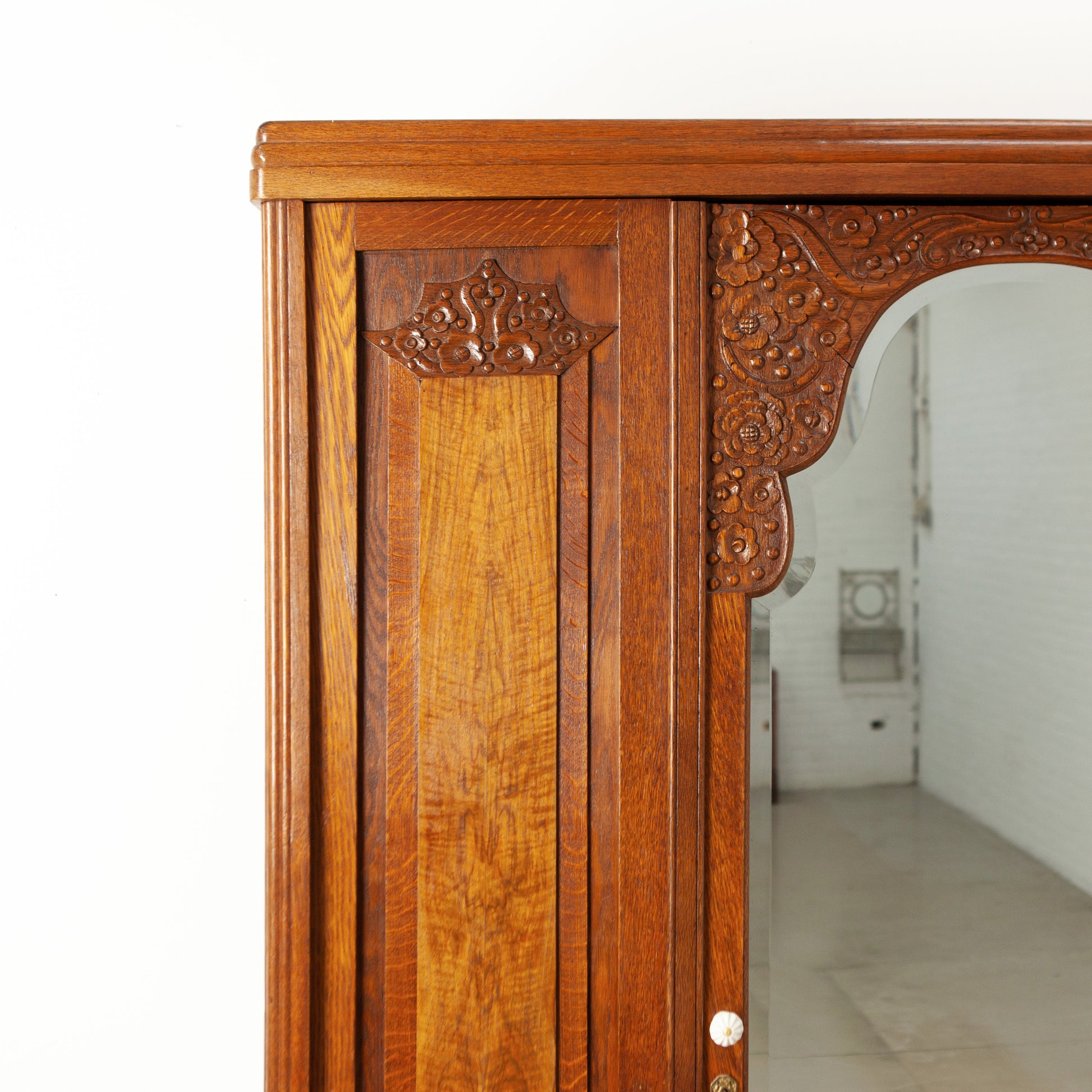 De linkerdeur sluit met twee schuifjes en de rechterdeur met een magneetje. De grote spiegeldeur en linkerzijkant zijn in de loop der tijd ietsje krom getrokken, maar dit is gelukkig totaal niet storend. De spiegeldeur sluit keurig met een werkend slot met sleutel.