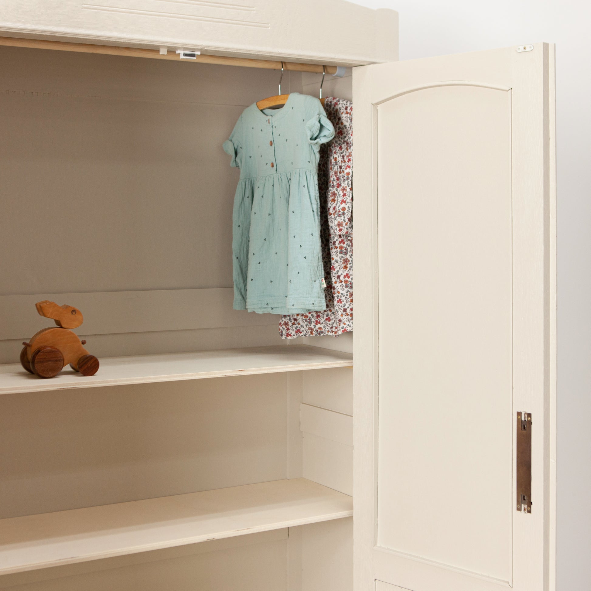 De kast kreeg aan de binnenkant 3 nieuwe planken en een roede. Zo is er genoeg ruimte voor alle kleertjes en andere spullen. Mocht je liever een extra plank willen, dan maken we die graag tegen een kleine vergoeding.