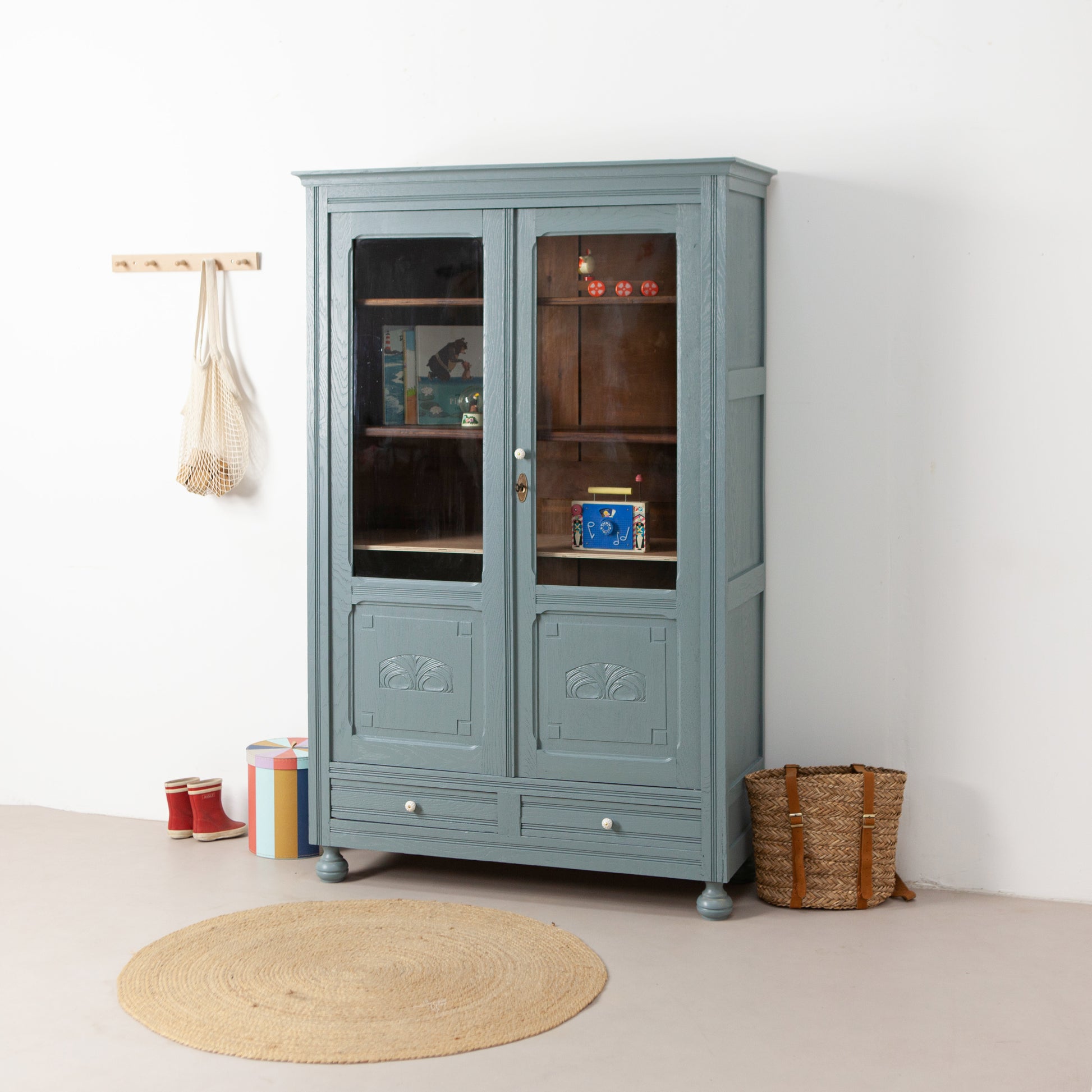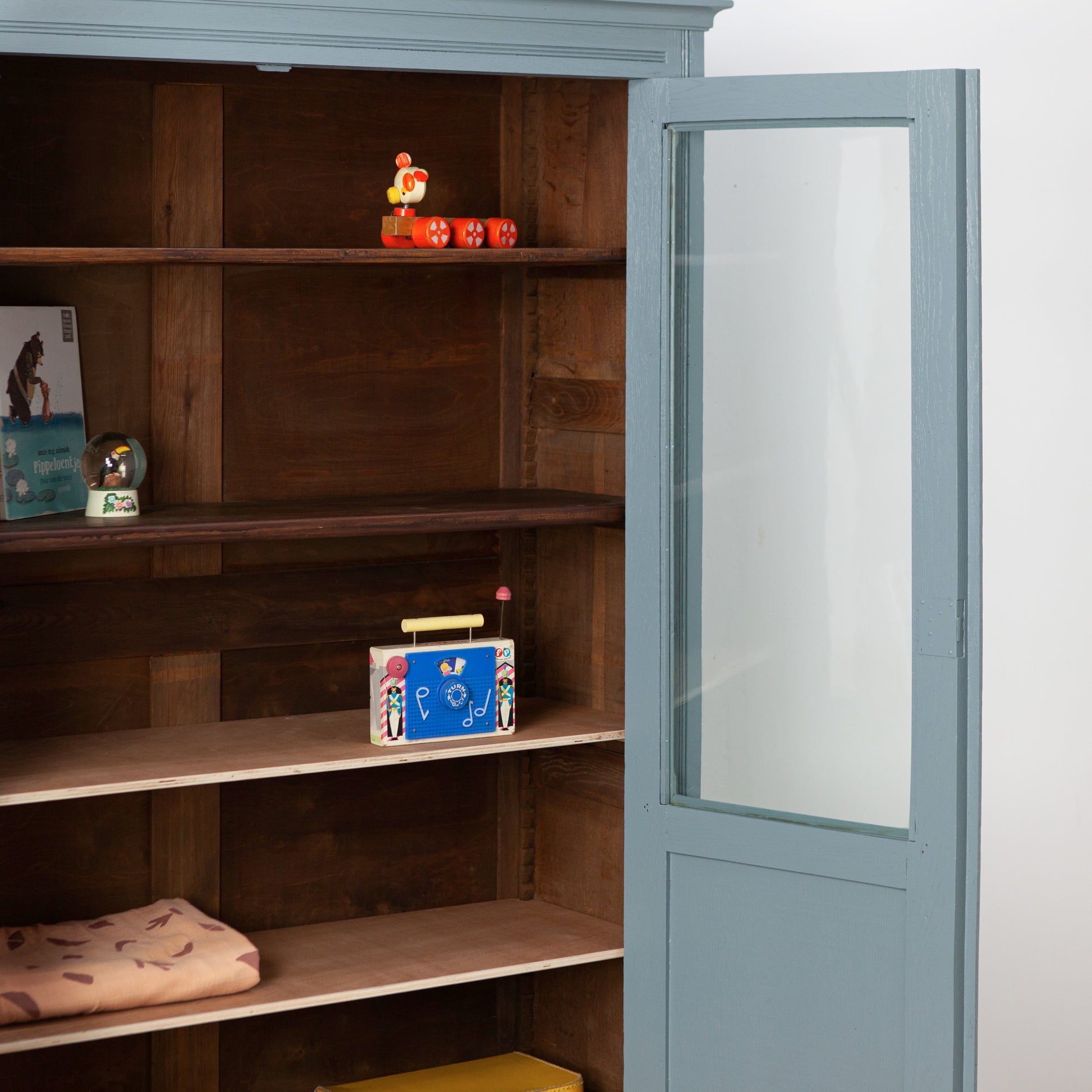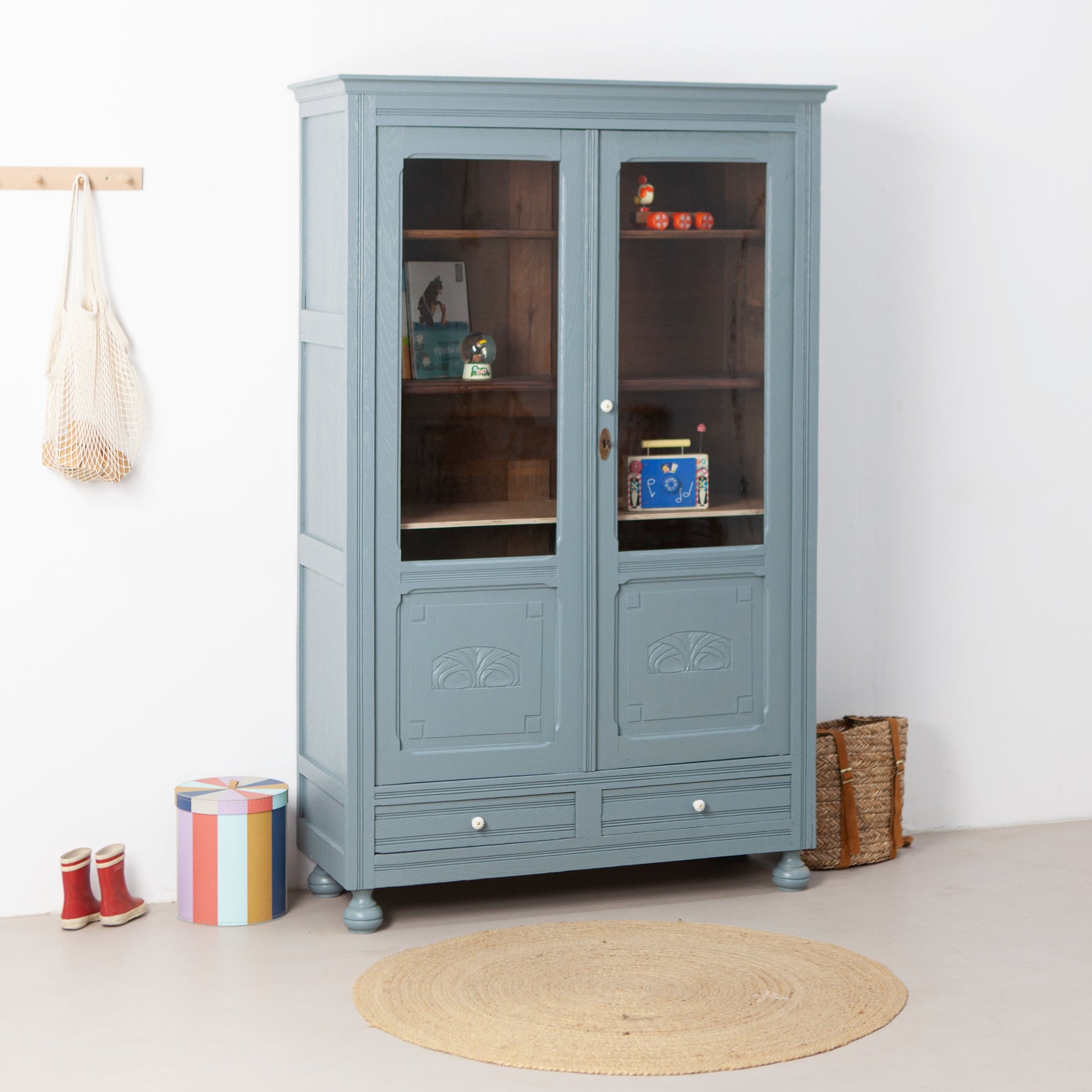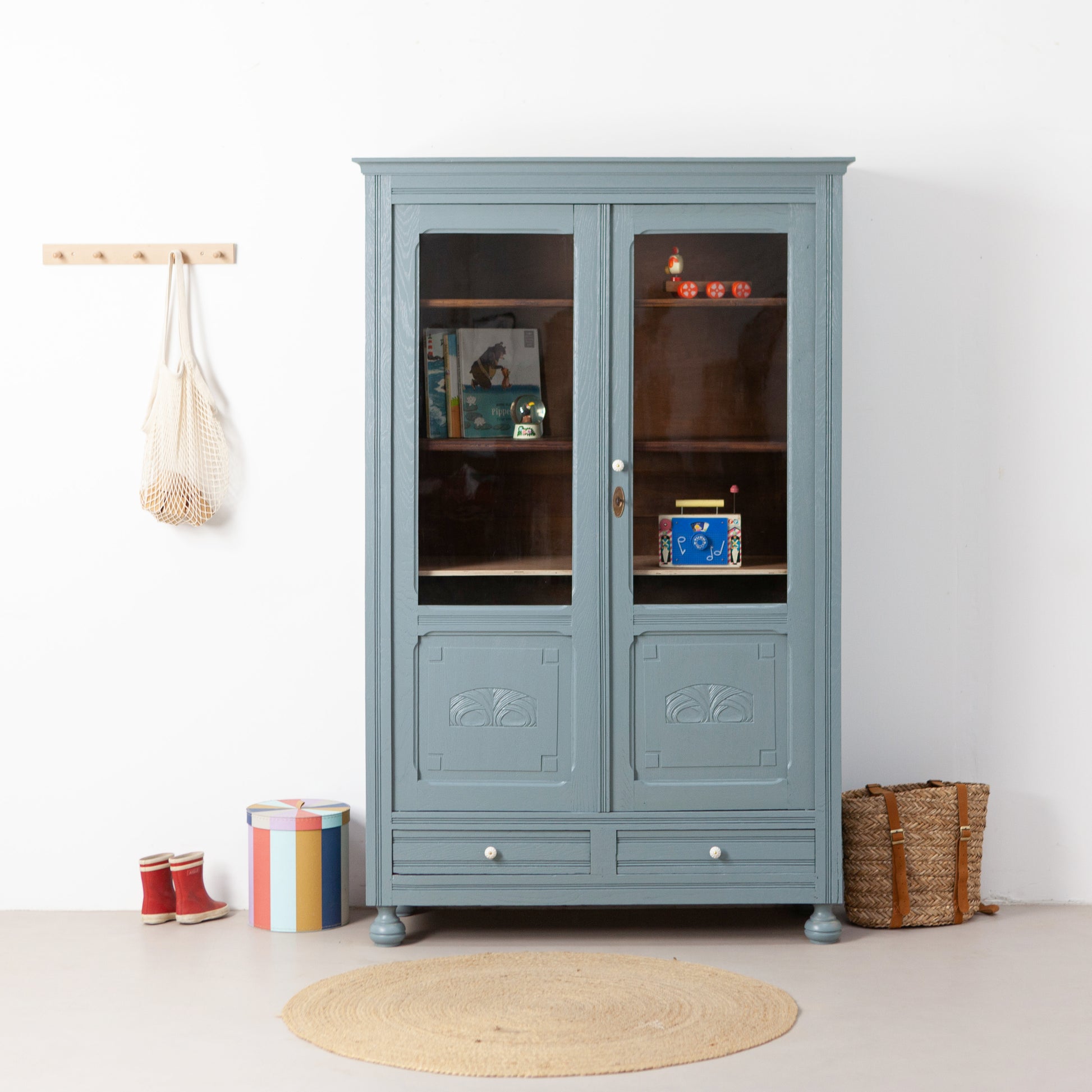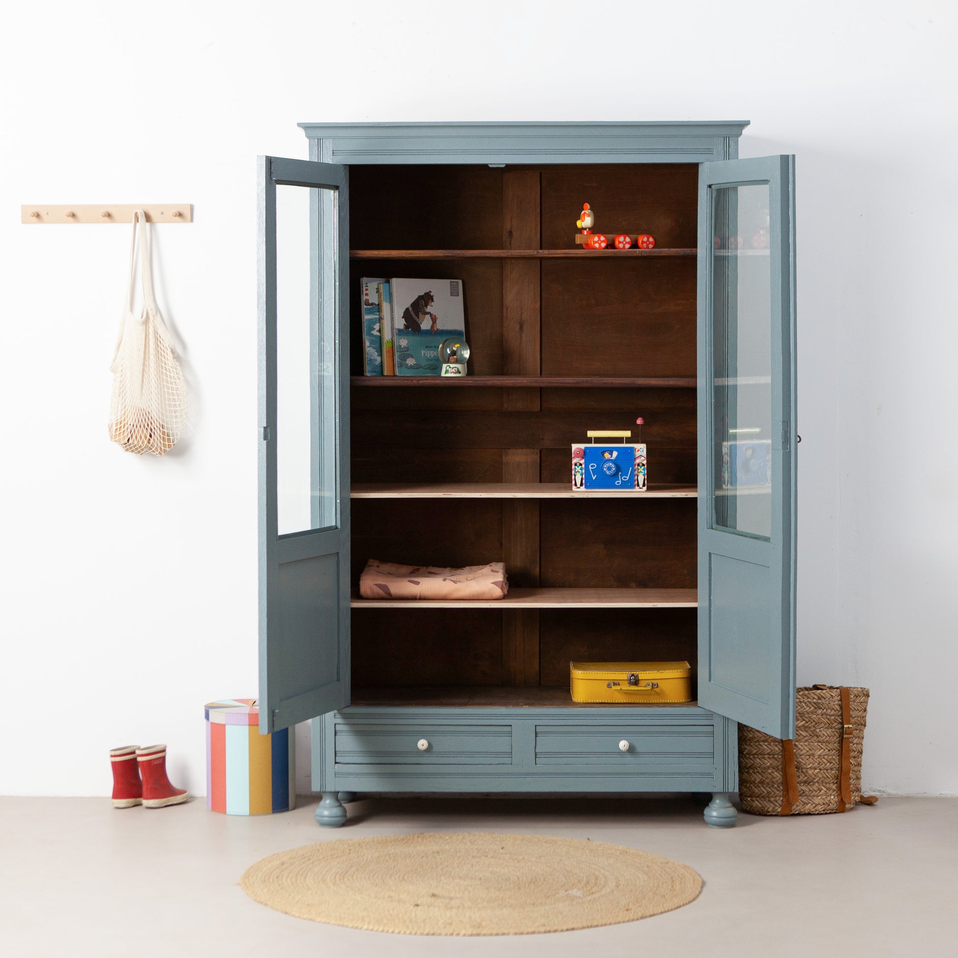 De kleur die we gekozen hebben voor deze kast is een hele rustige en stijlvolle blauw, en dat staat hem echt prachtig. Ook in combinatie met de kleur van het hout aan de binnenkant van de kast.